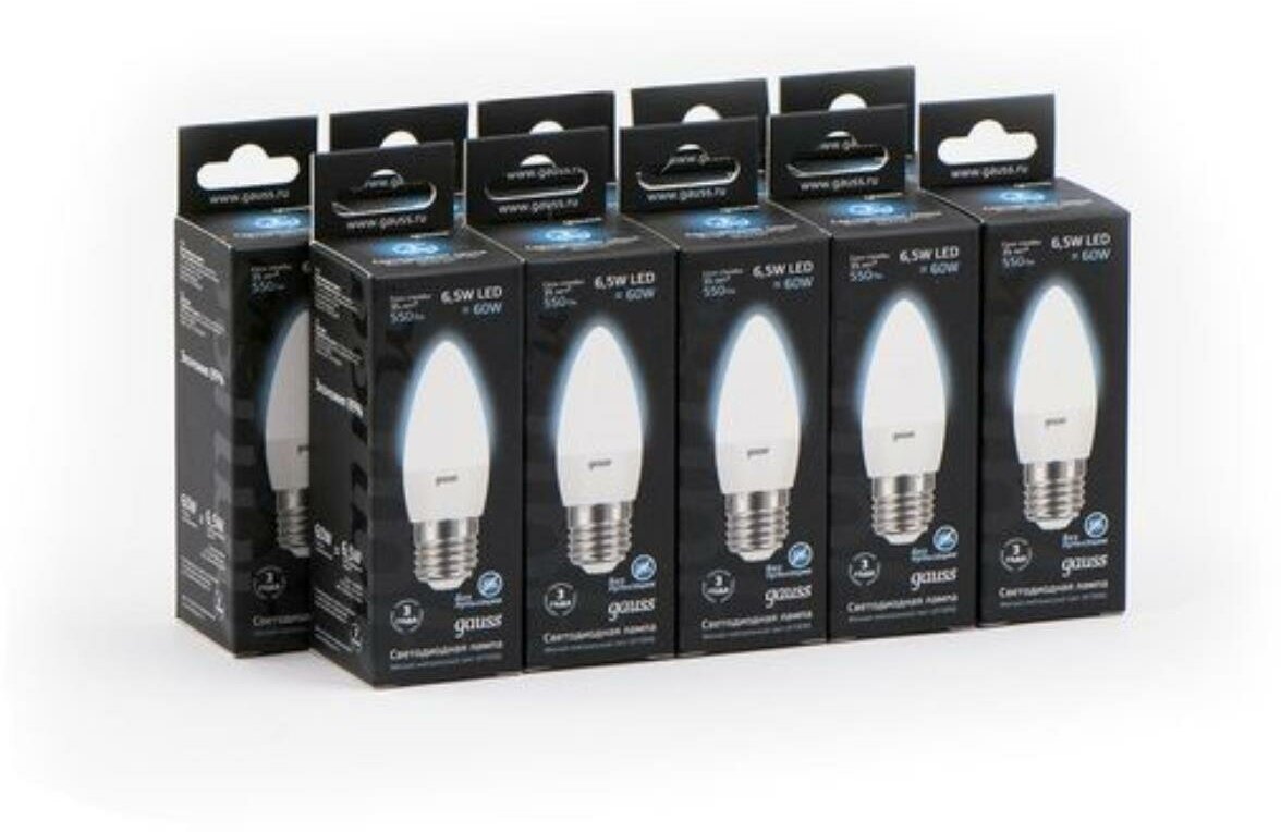 Лампа светодиодная Gauss 6.5Вт цок.E27 свеча 220B 4100K св.свеч.бел.ней. упак.10шт 103102207