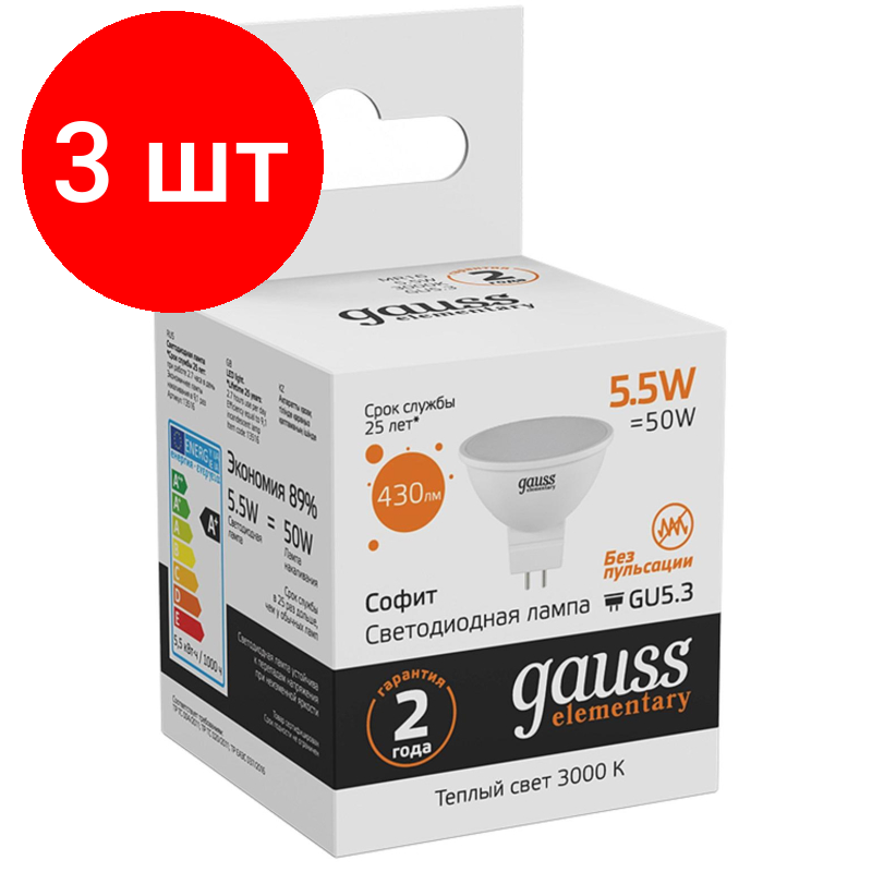 Gauss Лампа Elementary MR16 5.5W 430lm 3000К GU5.3 LED 3 шт (арт. 13516)