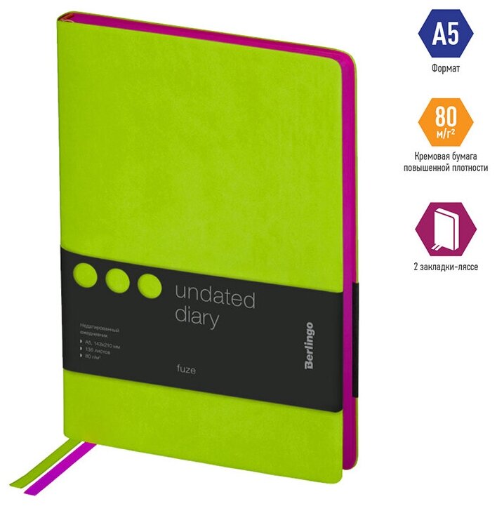 Ежедневник Berlingo Fuze недатированный на 2022-2023 год, А5, 136 листов, зеленый, цвет бумаги тонированный