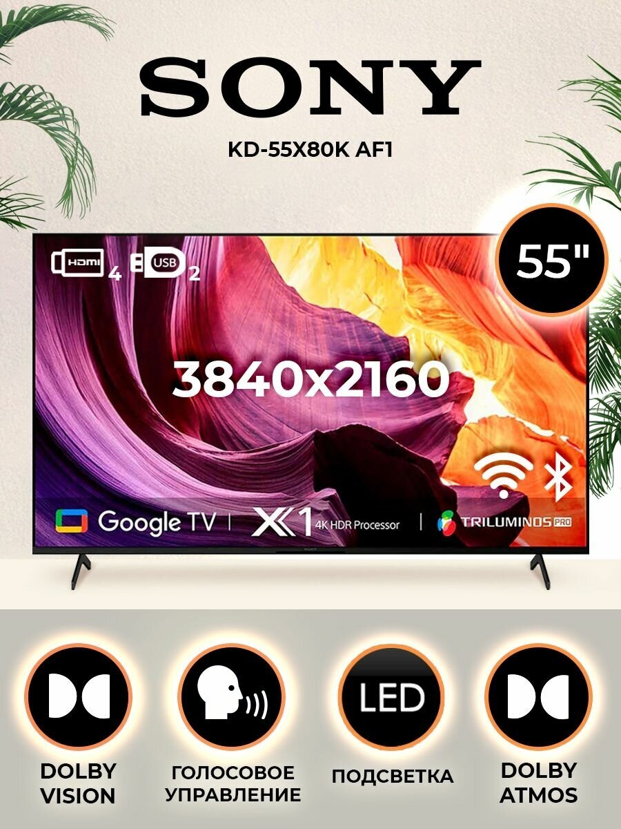 55" Телевизор Sony KD-55X80K 2022 HDR, LED, черный
