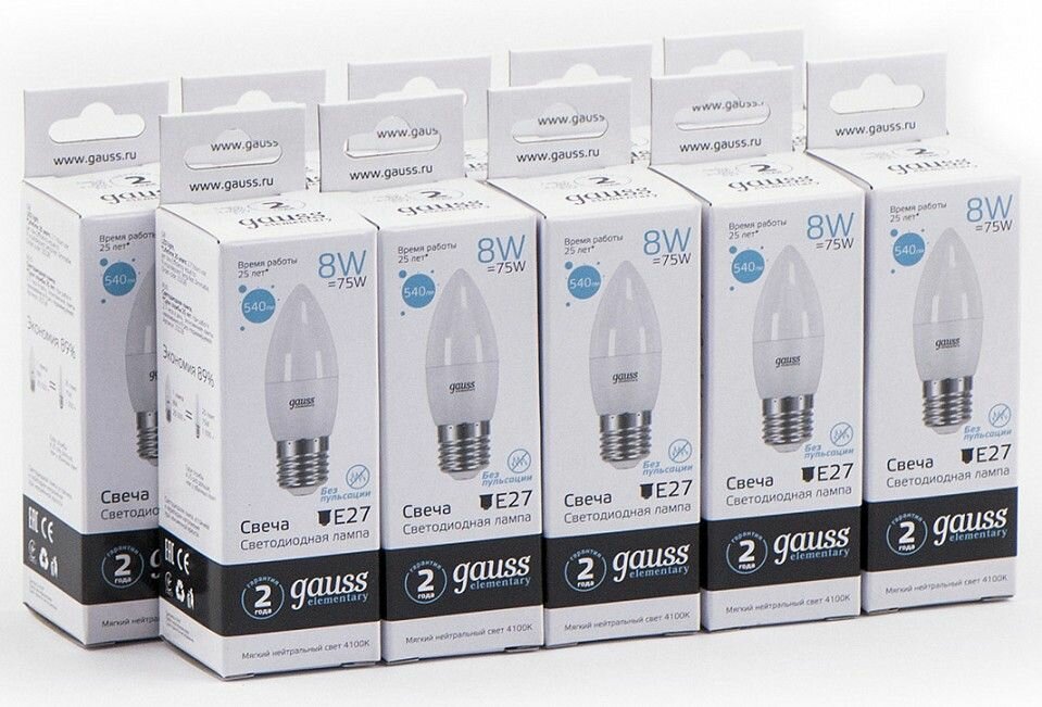 (10 шт.) Светодиодная лампочка Gauss Elementary Свеча E27 8W(540lm) 4100K 4K 100x37 матовая, пластик/алюм. 33228