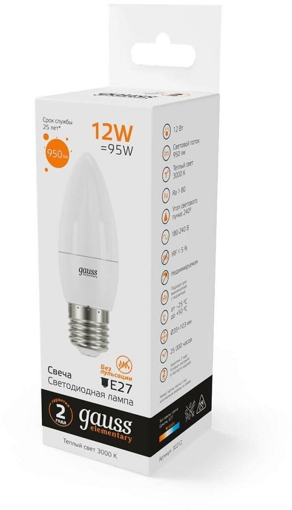 Ниже Вы можете прочитать отзывы на Лампа светодиодная Gauss Elementary 30212 12Вт цок.:E27 свеча 220B 3000K св.свеч.бел.теп. (упак.:10ш, ознакомится с подробными характеристиками, посмотреть интересные обзоры и фотографии на Лампа светодиодная Gauss Elementary 30212 12Вт цок.:E27 свеча 220B 3000K св.свеч.бел.теп. (упак.:10ш.