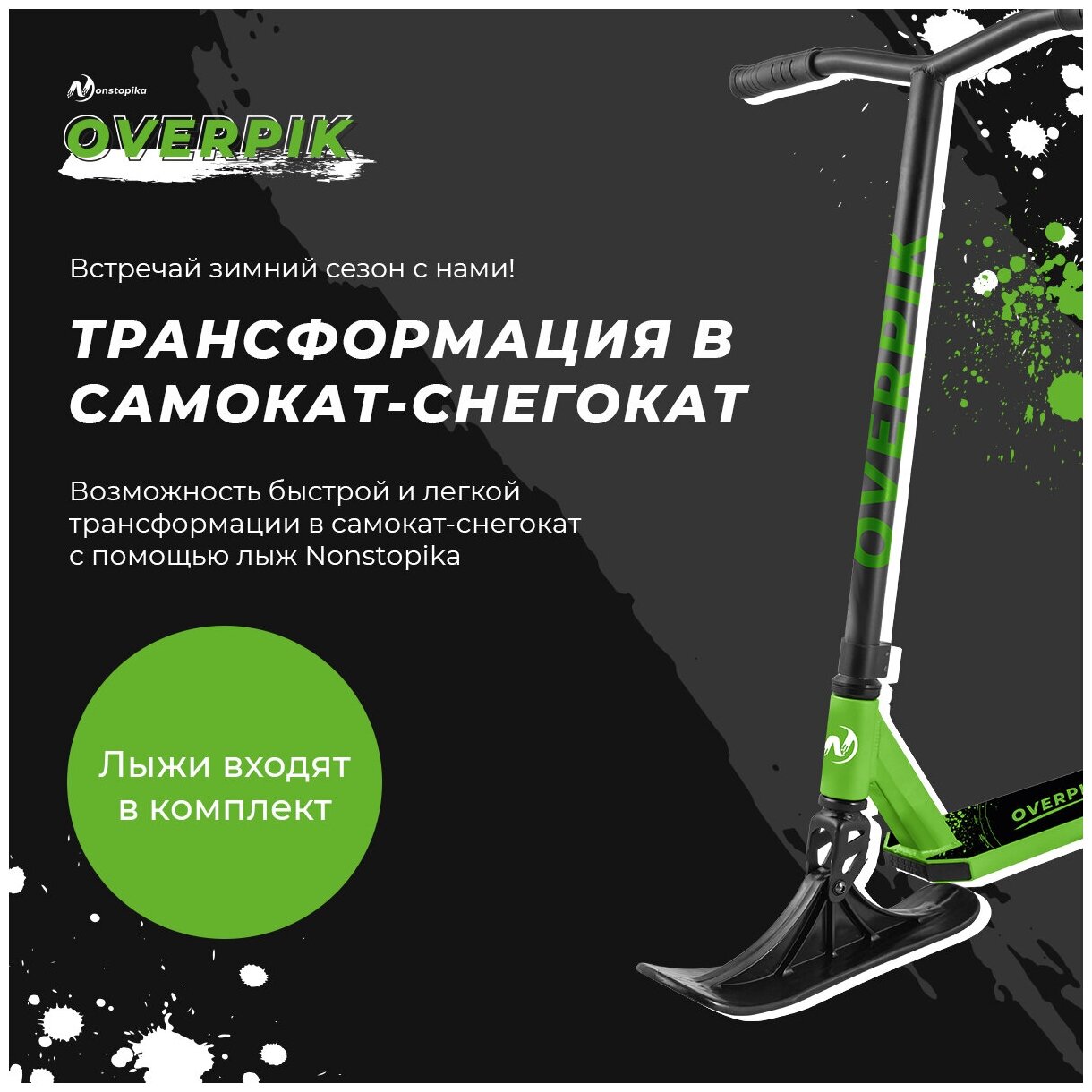 Самокат трюковый Nonstopika Overpik с лыжами (green) интересное: