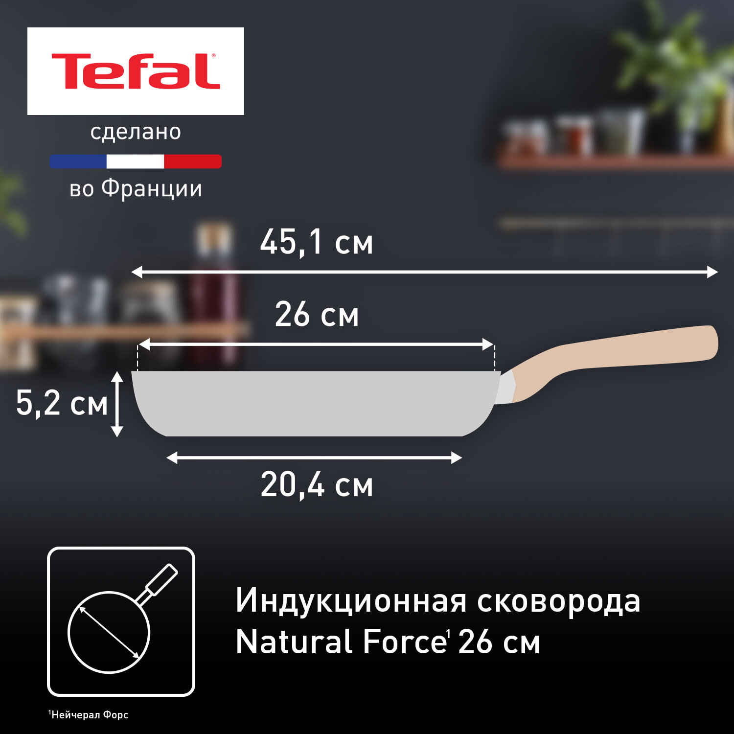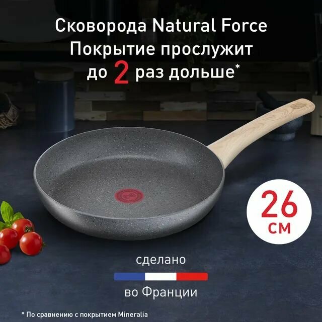 Сковорода Tefal Natural Force 26 см, с антипригарным покрытием и индикатором нагрева, подходит для всех типов плит, включая индукционные