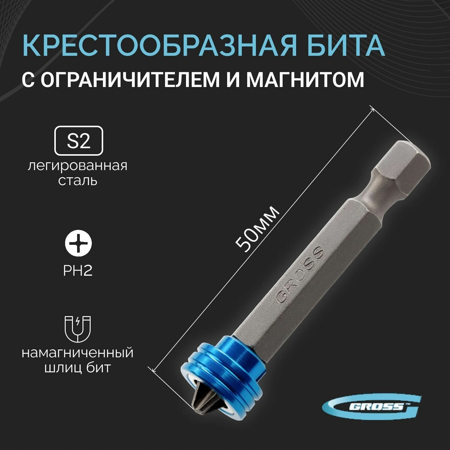 Бита PH2 x 50 мм с ограничителем и магнитом, для ГКЛ, S2 Gross 11456