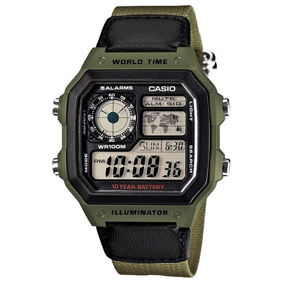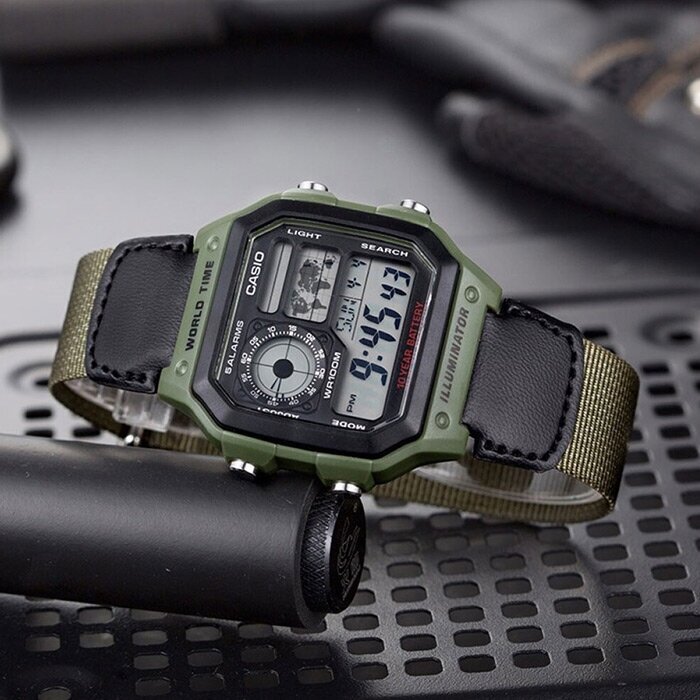 AE-1200WHB-1B Casio наручные часы кварцевые WR100 (10 атм) мужские, женские хаки таймер обратного отсчета, секундомер будильник отображение числа, второй часовой пояс, отображение дня недели, отображение месяца водонепроницаемые, подсветка дисплея акрилов