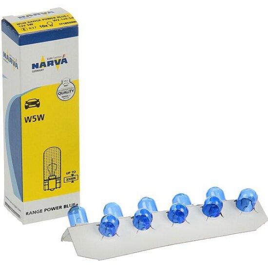 Лампа накаливания 10шт в упаковке W5W 12V 5W W2,1X9,5D RANGE POWER BLUE+ (упаковка 10 шт.), NARVA 17189RPB