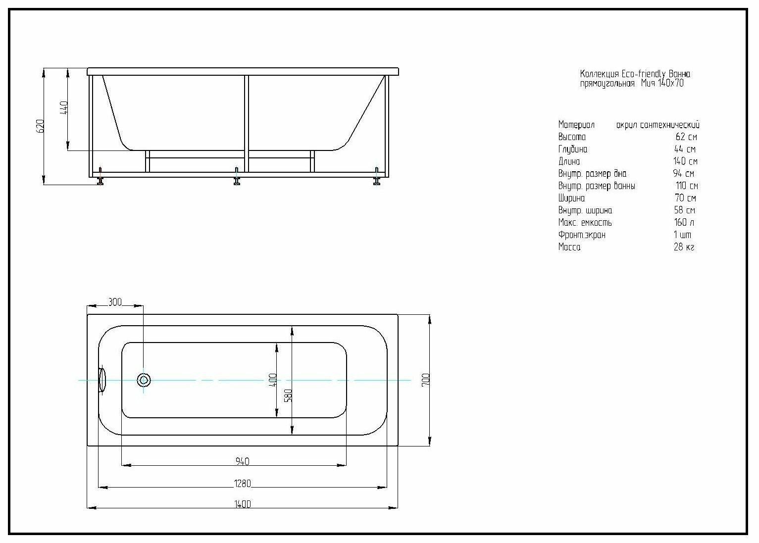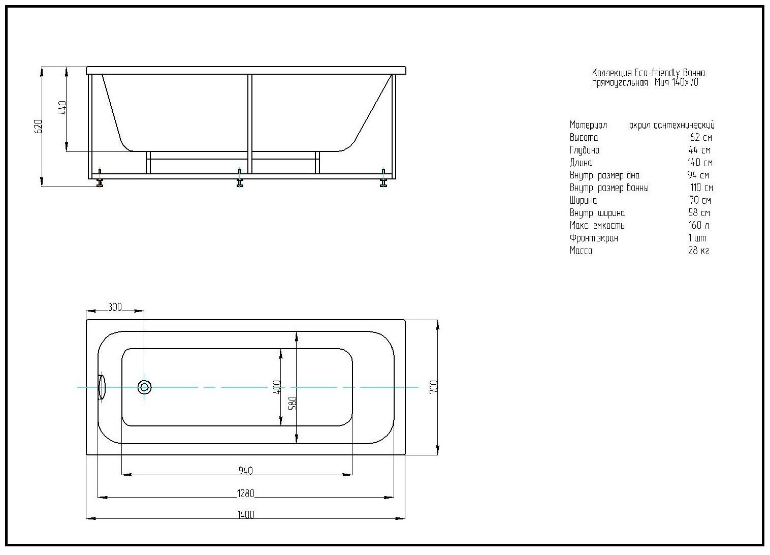 Ванна акриловая АКВАТЕК Мия 140х70 MIY140-0000001