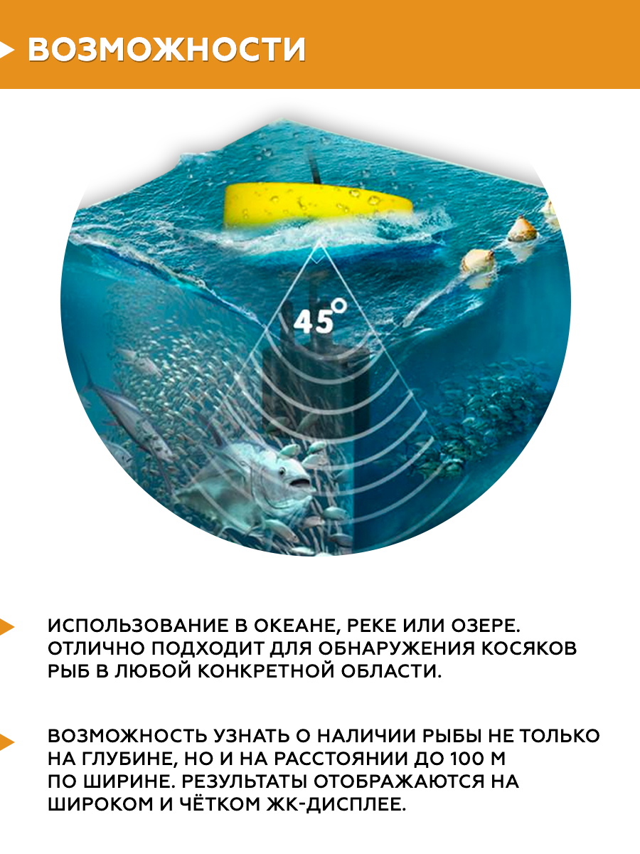 | Конструктивные особенности | беспроводной, боковое излучение, влагозащищенный корпус, для зимней рыбалки, подсветка экрана, с дисплеем, трансдьюсер в комплекте |