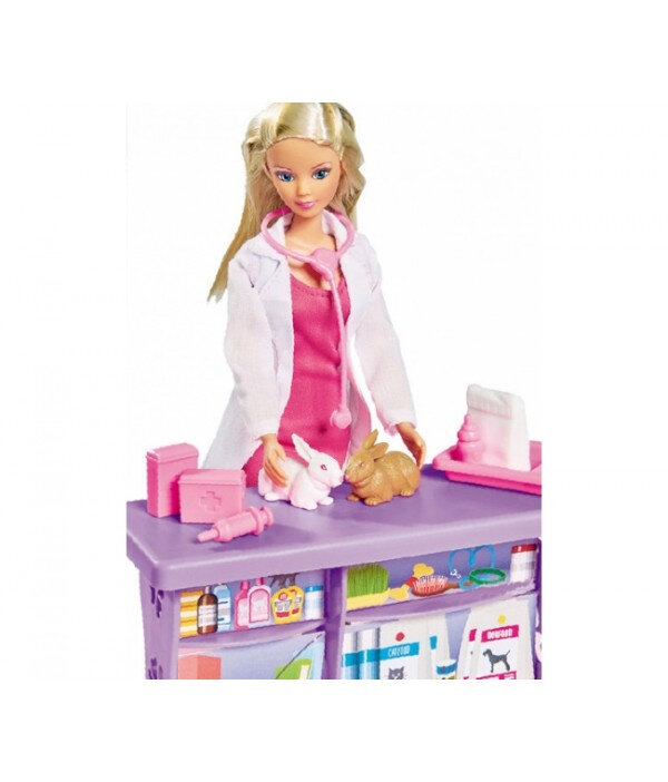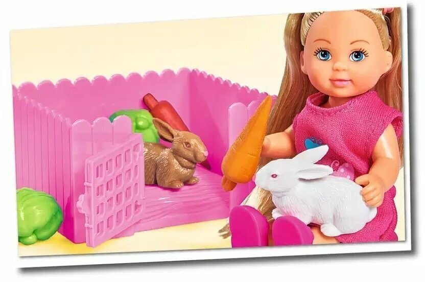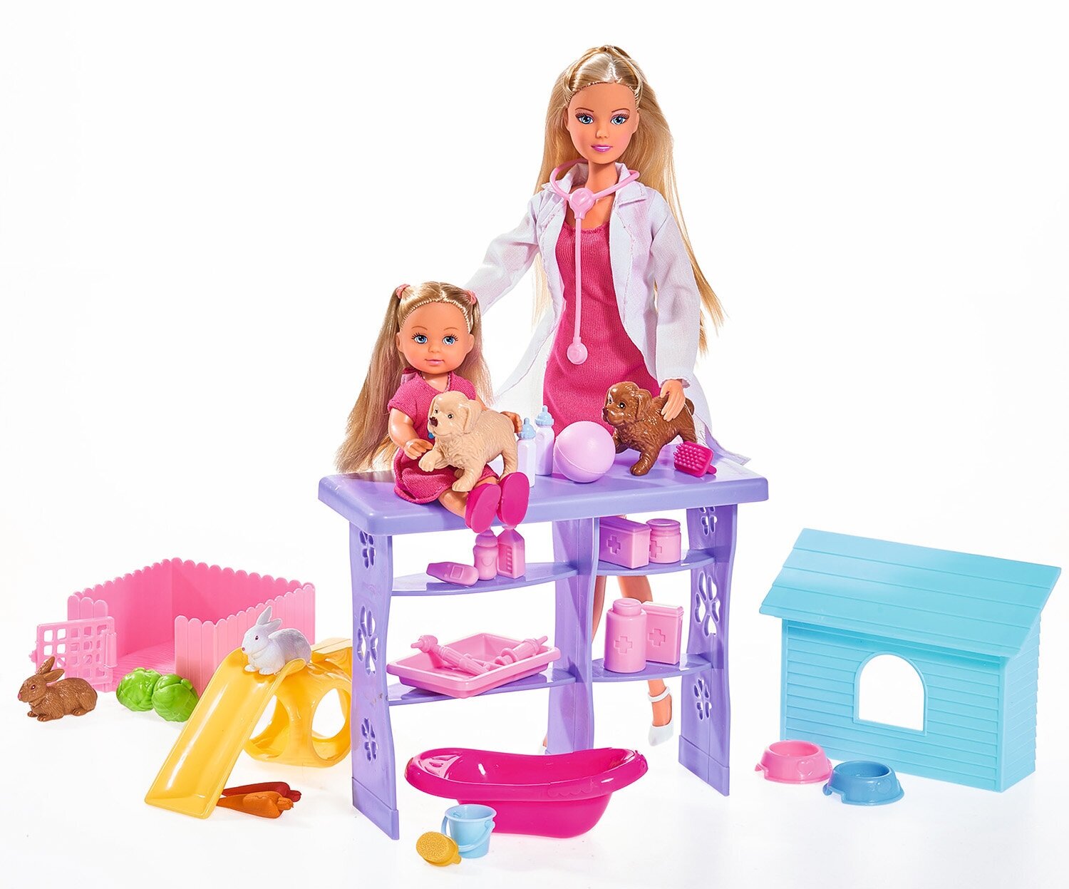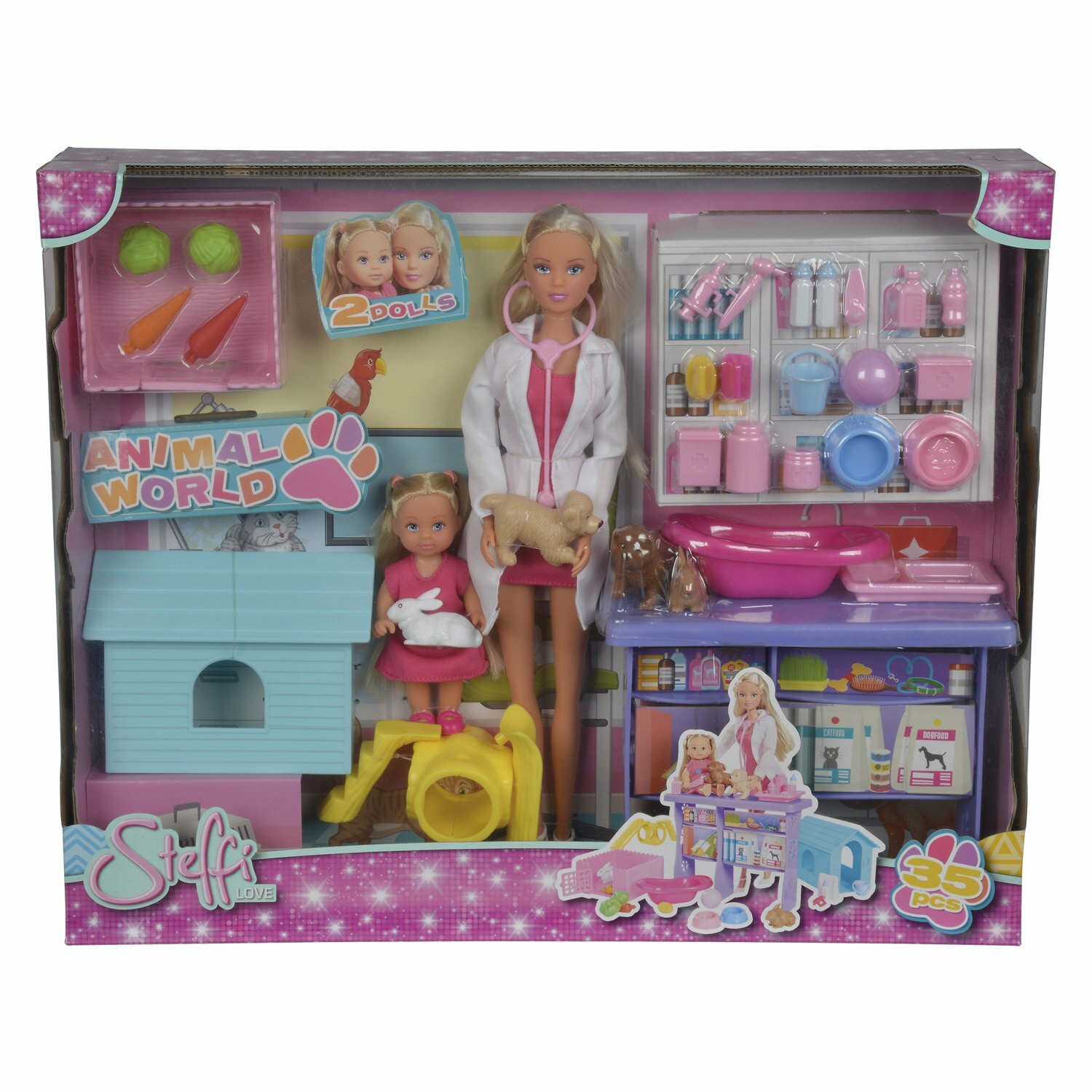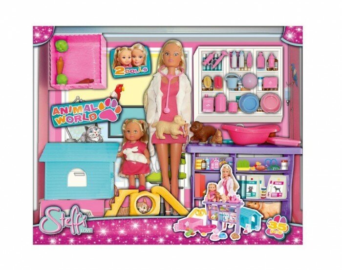 | Комплектация | кукла "Штеффи" 29 см , кукла "Еви", 2 кролика, 2 собачки, будка для собачки, домик для кроликов, ванночка, игровая площадка, морковка, капуста, миски для кормления, бутылочки, медицинские принадлежности |