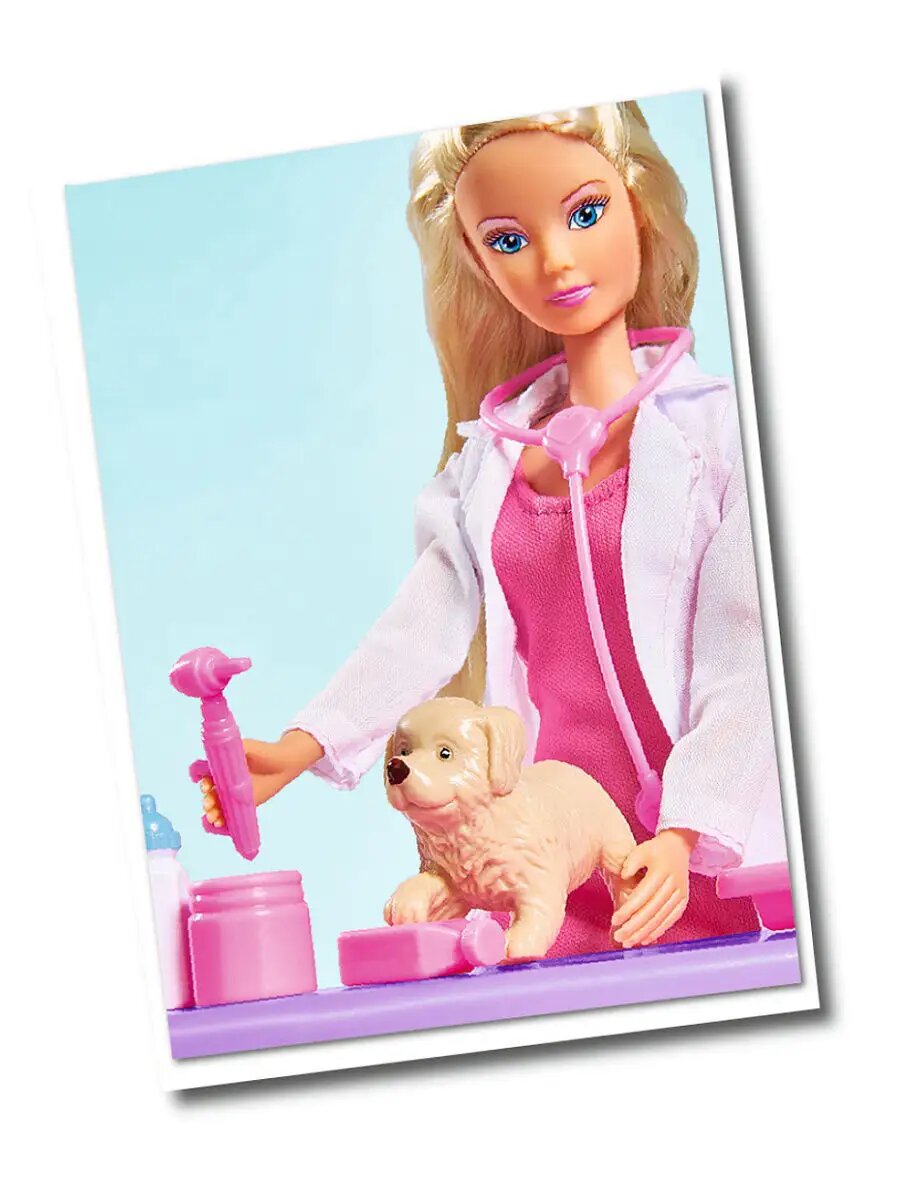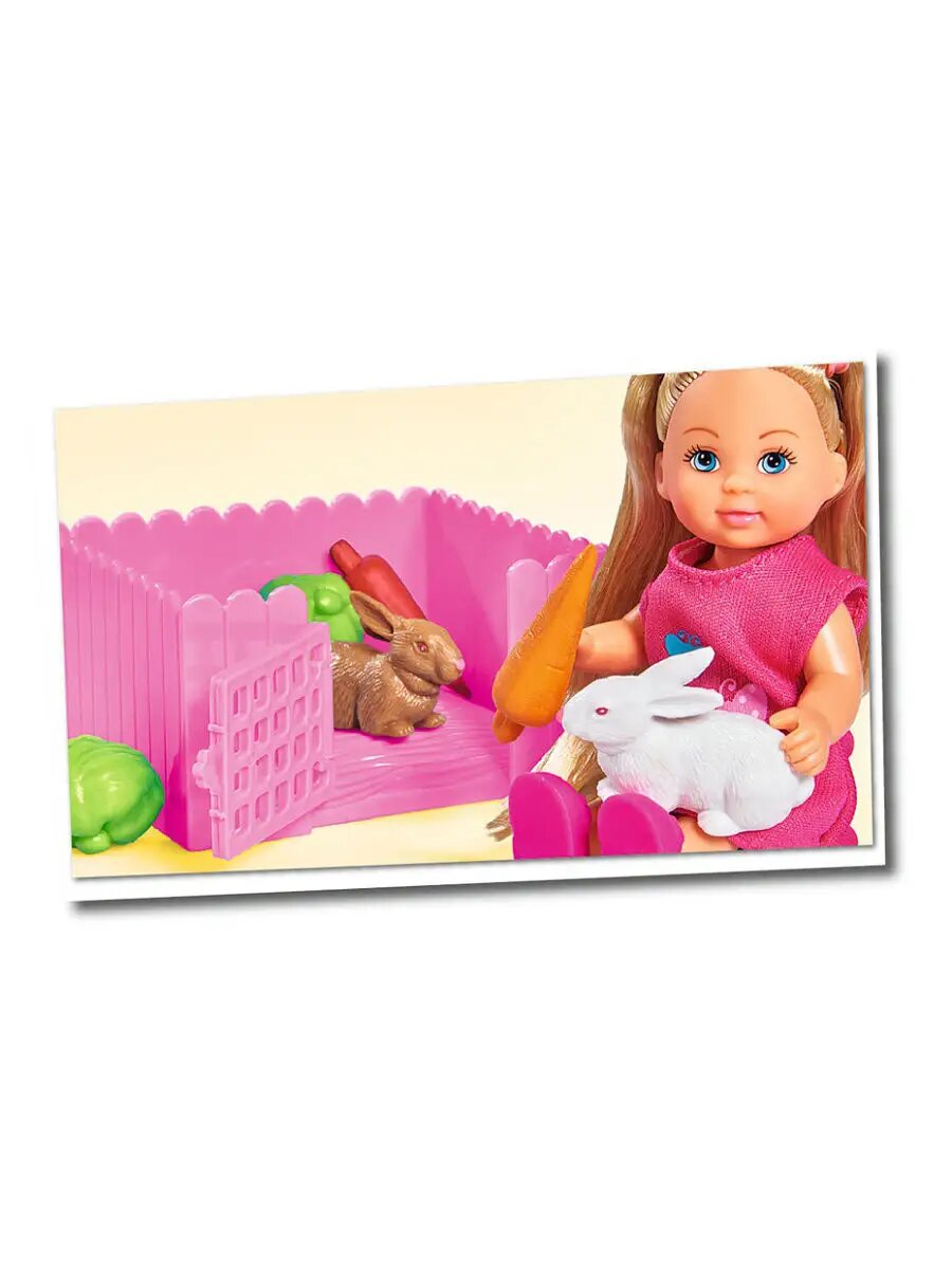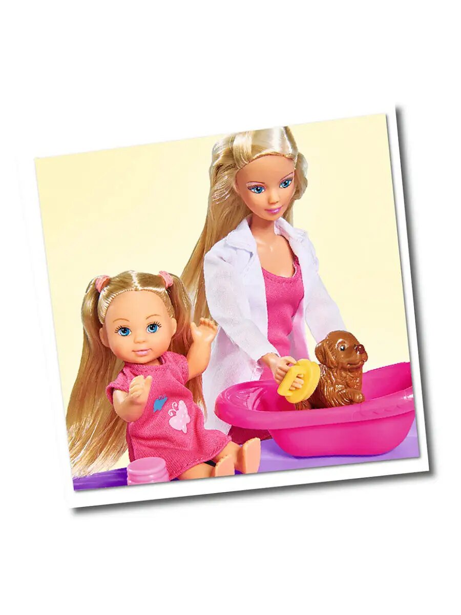 | Комплектация | кукла "Штеффи" 29 см , кукла "Еви", 2 кролика, 2 собачки, будка для собачки, домик для кроликов, ванночка, игровая площадка, морковка, капуста, миски для кормления, бутылочки, медицинские принадлежности |