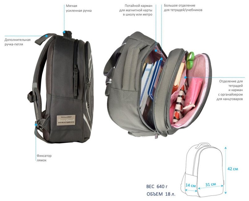 | Конструктивные особенности | две лямки / мягкий / светоотражающие элементы / эргономичная спинка |
