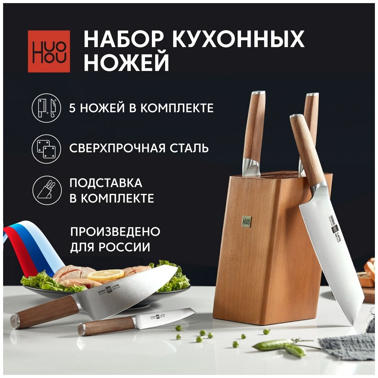 Набор кухонных ножей из сверхпрочной стали (5 ножей + подставка) Xiaomi (Mi) HuoHou Molybdenum Vanadium Steel Kitchen Knife Set (HU0158), русская версия!!!, коричневый