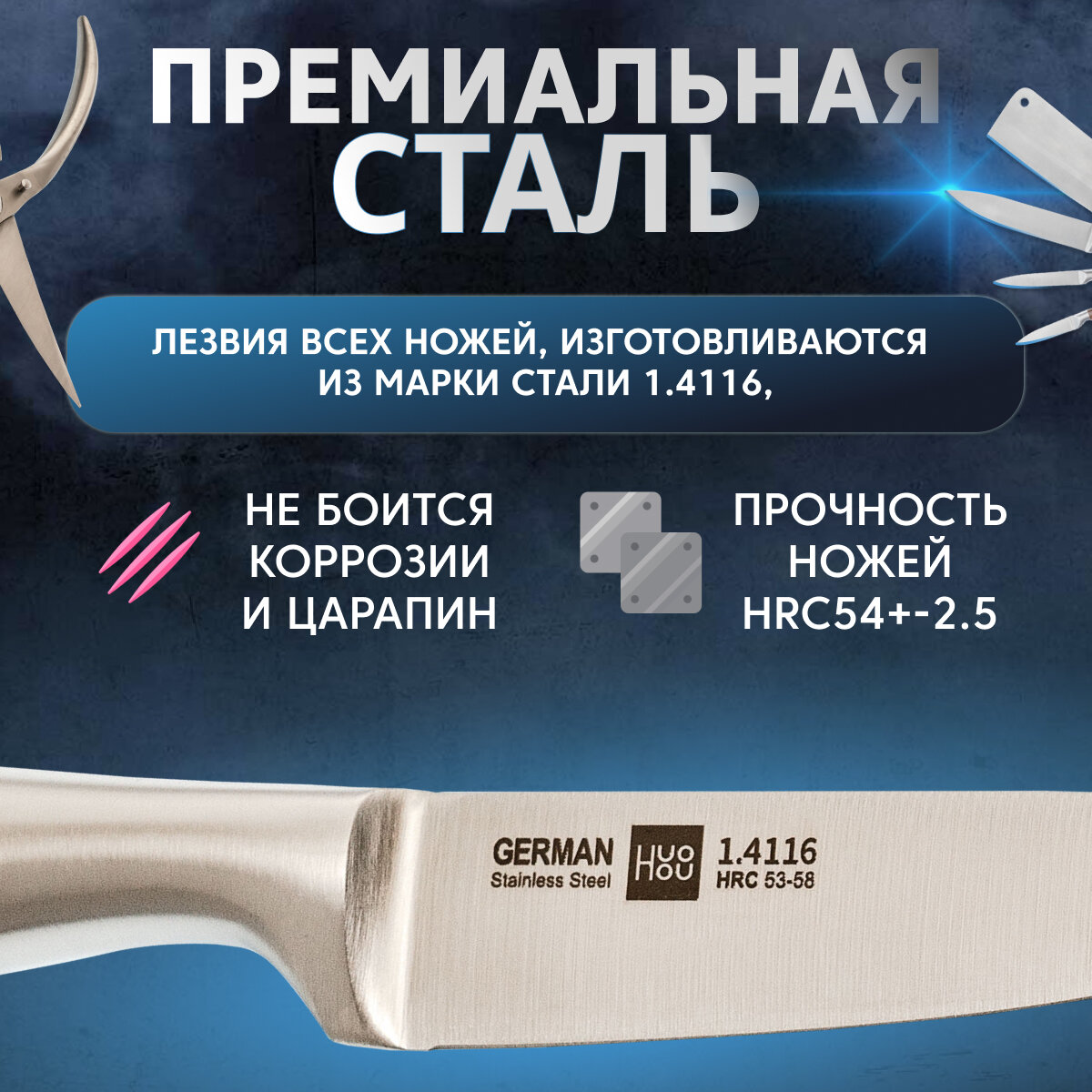 Набор стальных ножей Huohou 6-Piece Stainless Steel Kitchen Knife Set (HU0014), (4 ножа + ножницы + подставка) русская версия!!!, серебристый