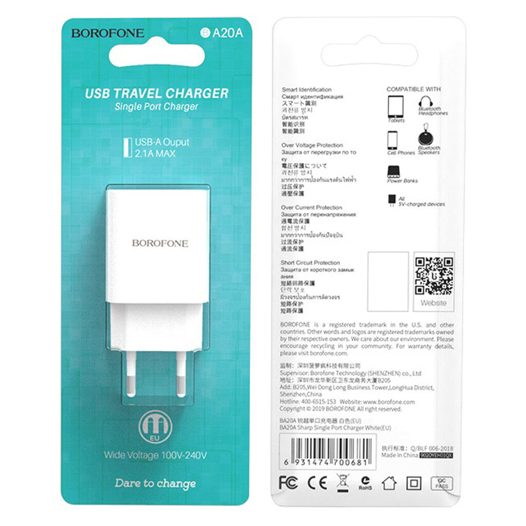 ЗУ Сетевое Borofon BA20A 1*USB, 2,1А, блистер белый
