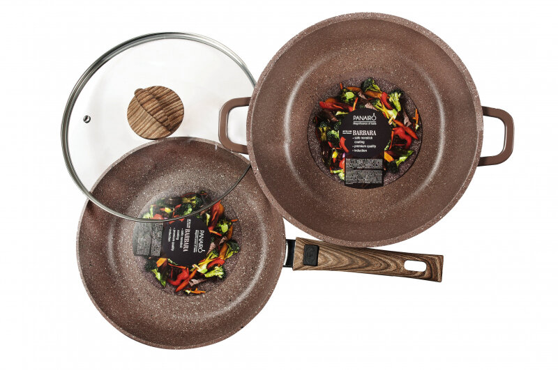 Набор посуды PANAIRO "Barbara MAX" №1 из 3-х предметов Комплектация: 1.Индукционная глубокая сковорода 26см PANAIRO "Barbara MAX" cо съемной ручкой soft-touch 2.Индукционная кастрюля 5,5л PANAIRO "Barbara MAX" c ненагревающимися ручками soft-touch 3.Крышк
