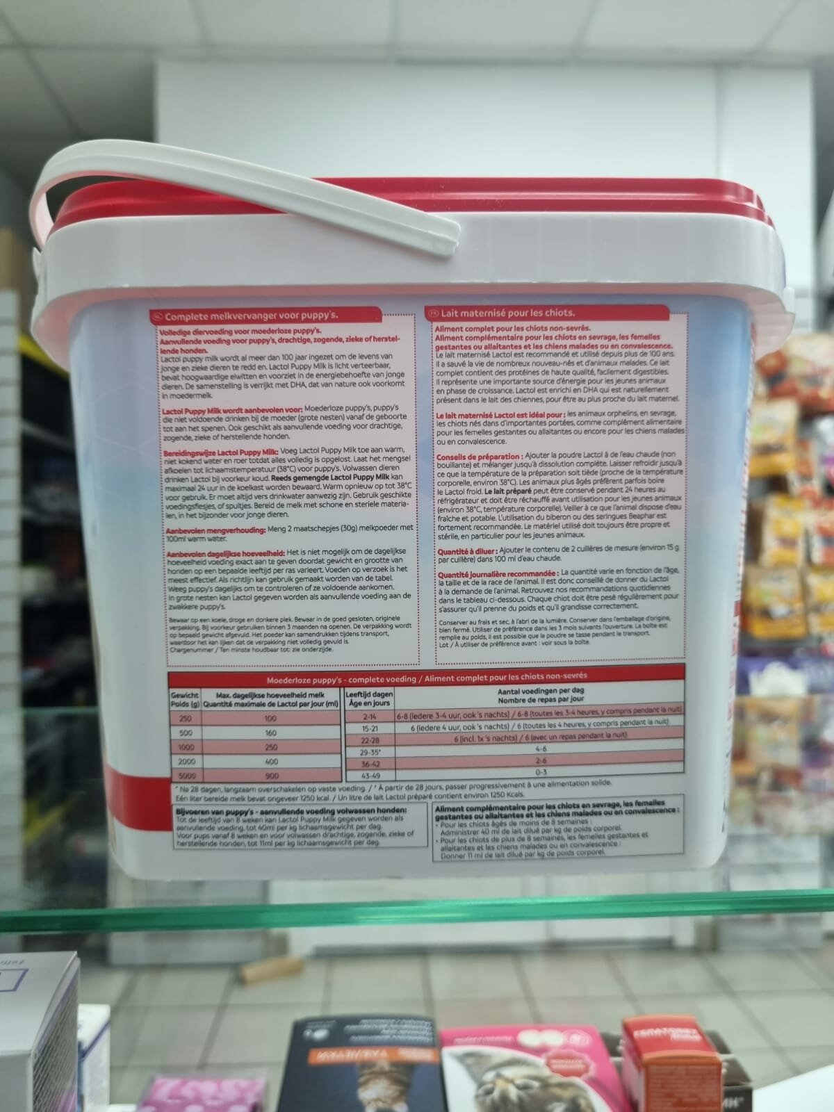 | Дозировка | 2 мерных ложки (30 г) без горочки (в одной ложке ~15 г) на каждые 100 мл теплой воды; определение точной суточной нормы невозможно по причине различий в возрасте, размере и породе; наиболее эффективным является кормление по требованию |