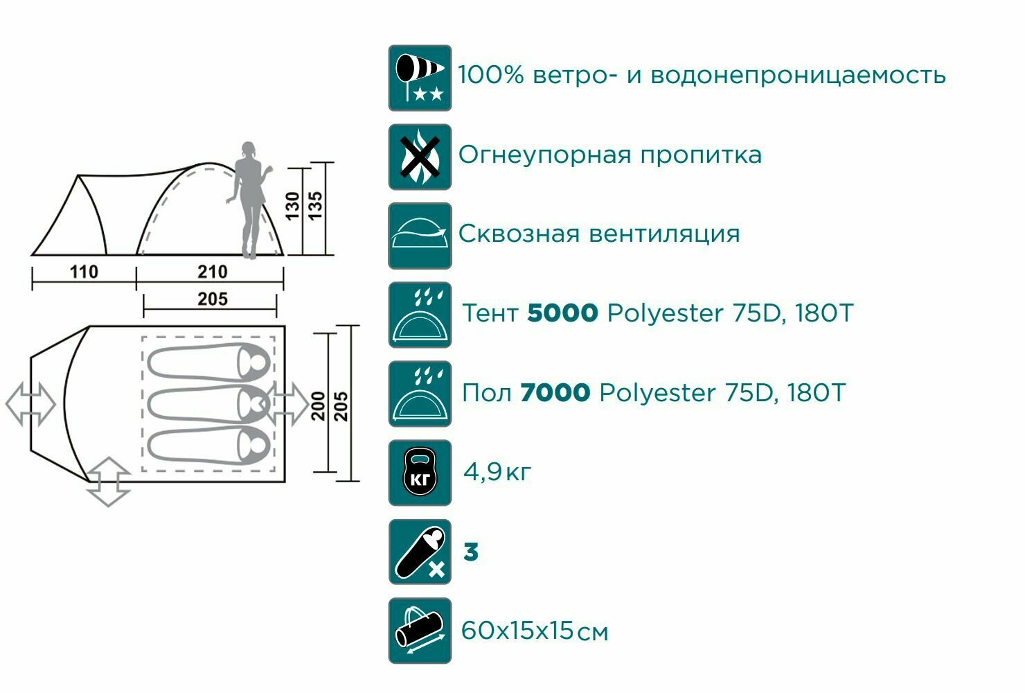 | Особенности | вентиляционные отверстия / внутренняя палатка / огнеупорная пропитка / Герметизация швов / крепление для фонарика / Полная защита от влаги / противомоскитная сетка / тамбур / штормовые оттяжки |