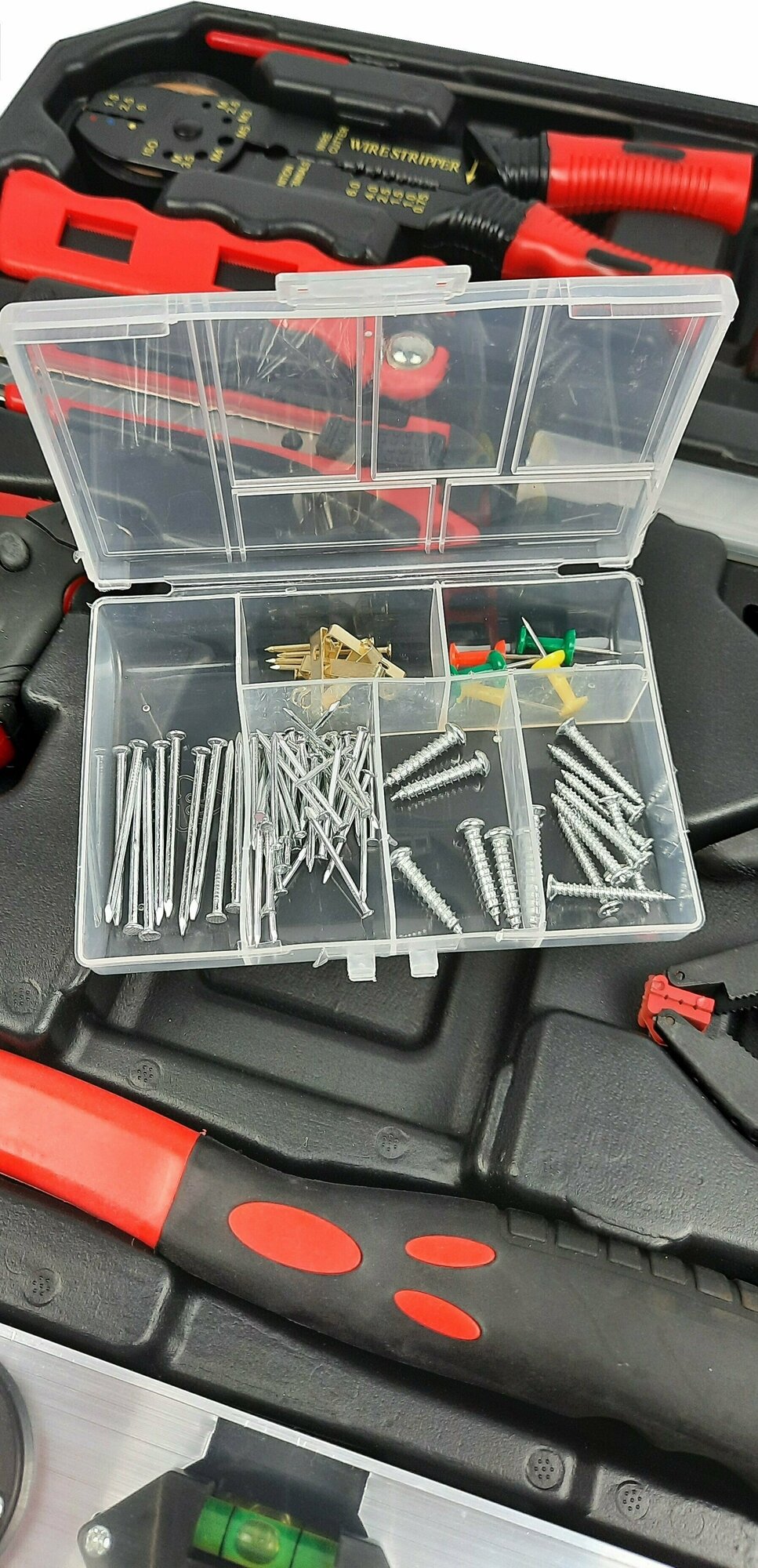 | Дополнительная информация | магнитный извлекатель, нож многоцелевой, лезвия для ножа, длинноносые плоскогубцы 6", переставные плоскогубцы 6", диагональные плоскогубцы 6", зажимные плоскогубцы 7", плоскогубцы 9", разводной ключ 8", кусачки 6", рулетка 5 м, трещётка 3/8", головка свечная 3/8"х16 мм и 3/8"х21 мм, удлинитель торцевых головок 3/8х3", шарнир карданный 1/4" и 3/8", адаптер 1/4х3/8", телескопический магнит, клещи для снятия изоляции 8", наклонные ножницы 7", зажимы нейлоновые 3", рулетка измерительная 5 м, мини-пила, уровень алюминиевый 10", хомут нейлоновый, набор крепежный (90 шт), надфиль 150мм |