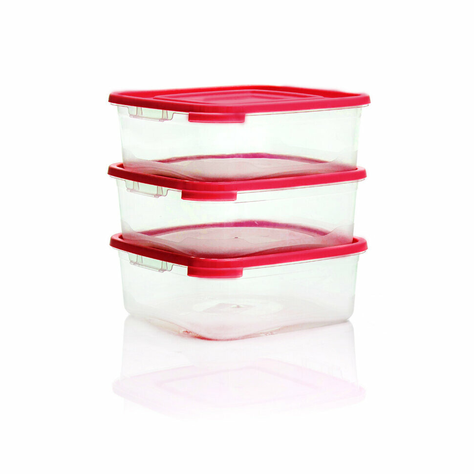 Контейнер пищевой 0,7 л комплект 3 шт., ланч бокс, каскад квадро, 9х14х14 см, прозрачный/красный, 64001, 436400165, 608209