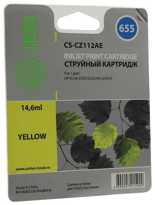 Картридж струйный Cactus Cs-cz112ae 655 желтый (14.6мл) для HP DJ IA 3525/5525/4525 Cs-cz112ae