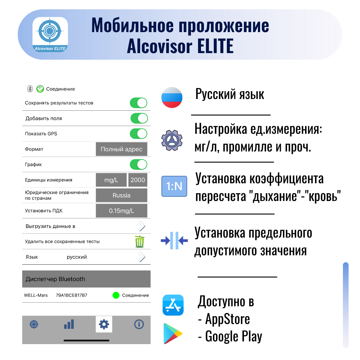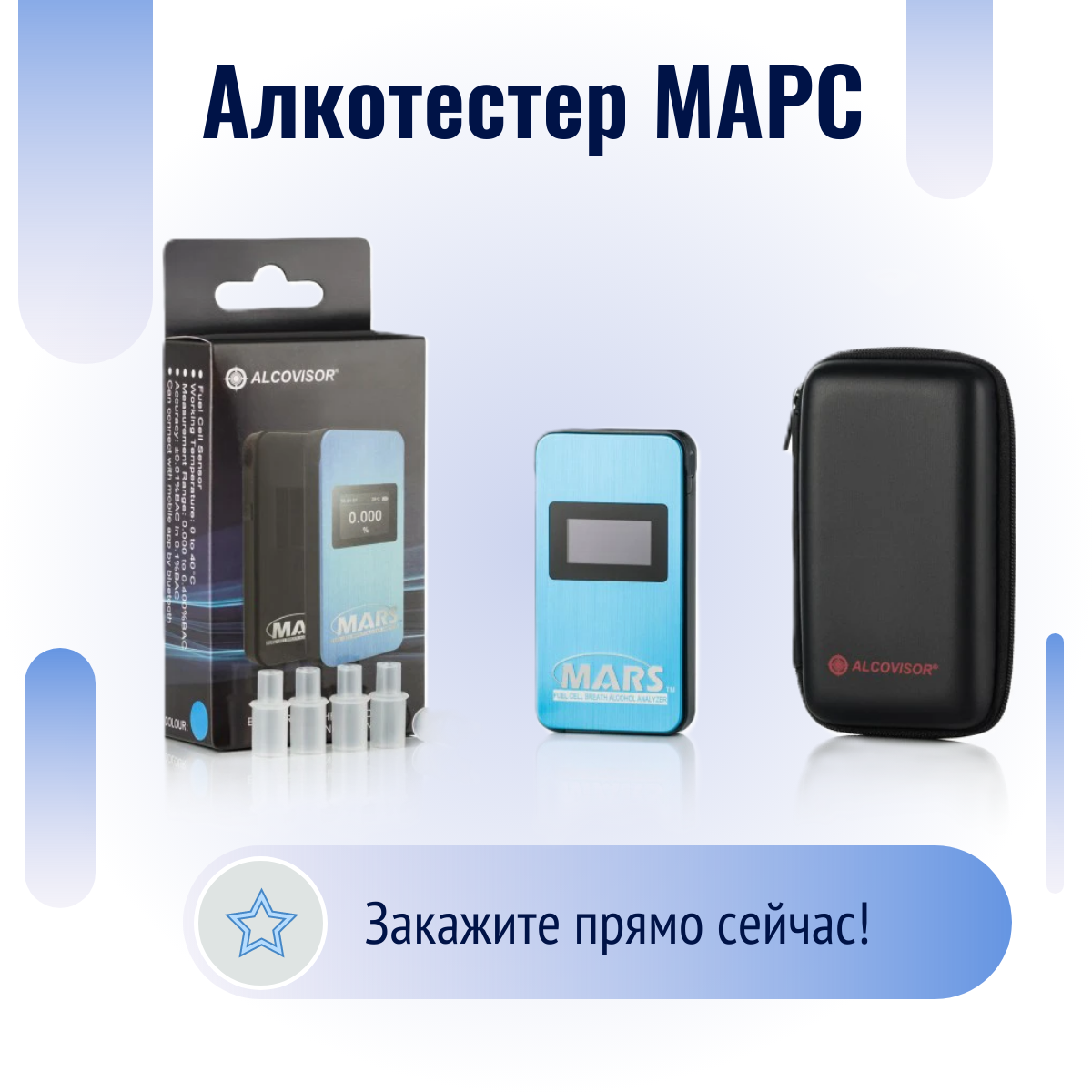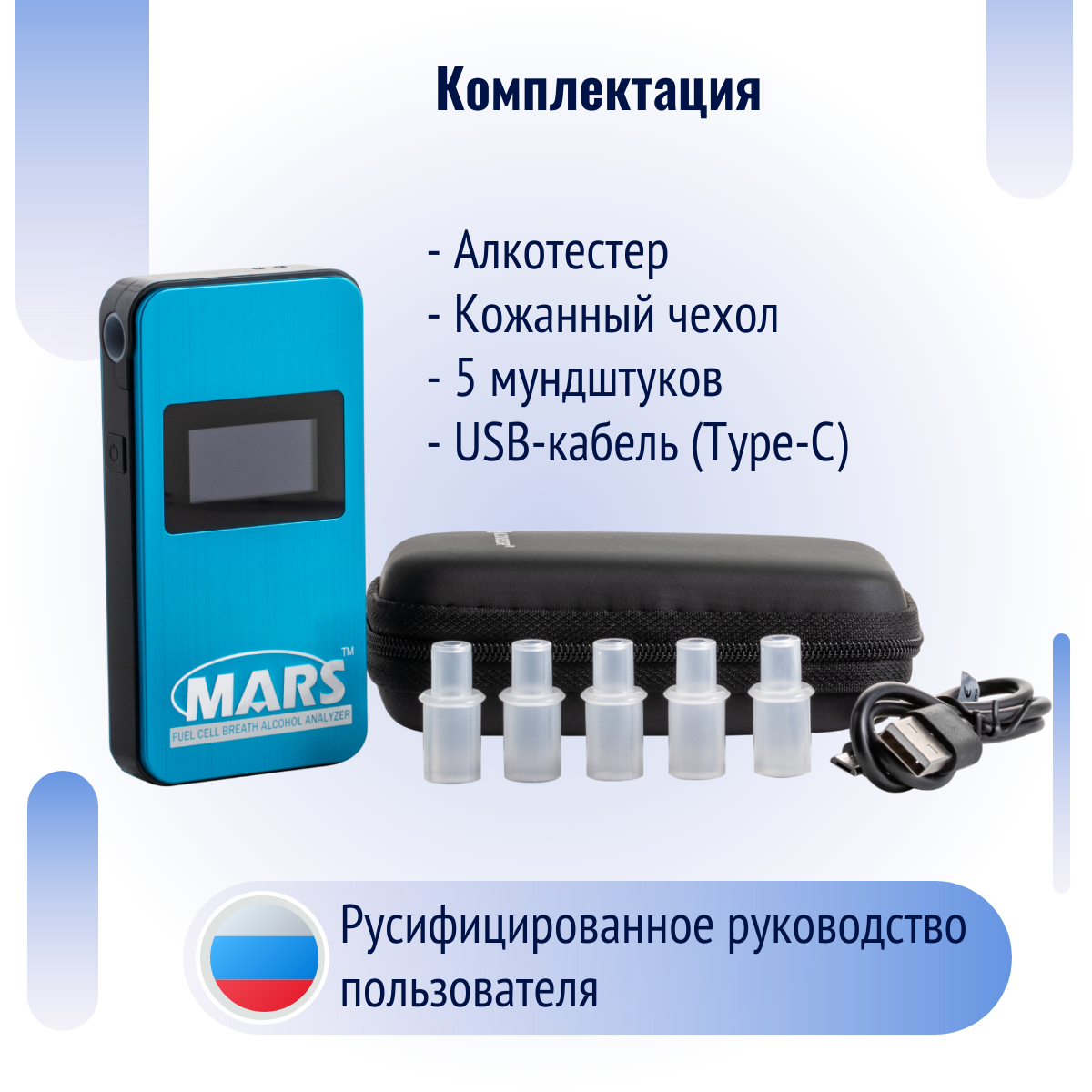 | Подробная комплектация | Алкотестер МАРС. Кожаный контейнер-чехол. 5 мундштуков. USB-кабель. Русифицированное руководство по эксплуатации. Русифицированная инструкция по калибровке!!! |