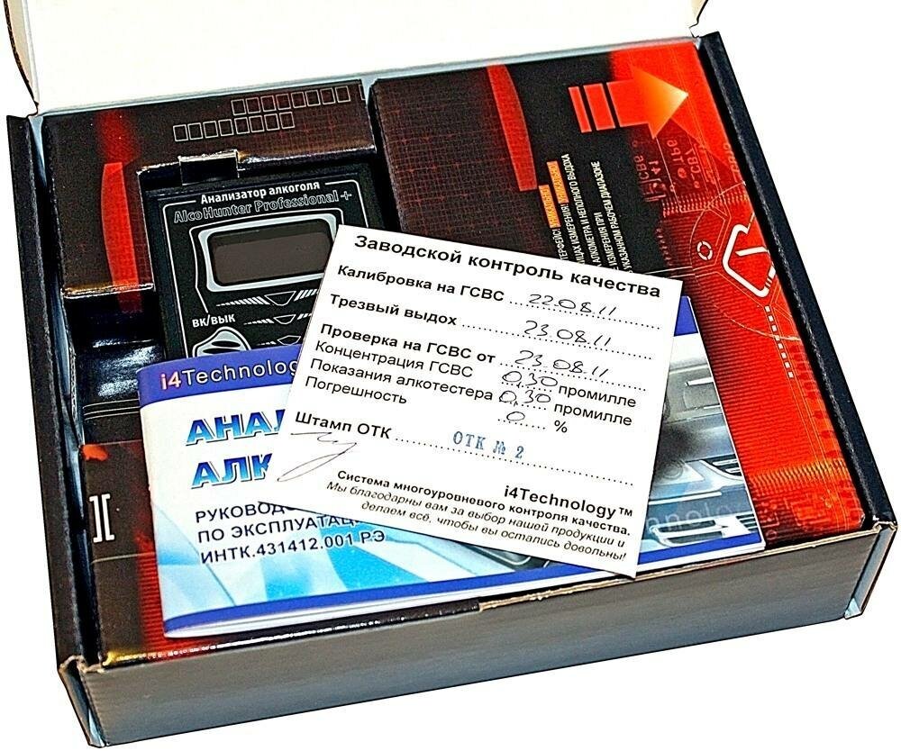 | Подробная комплектация | Алкотестер "AlcoHunter Professional+"; Батарейки типоразмера "ААА" — 2 шт.; Сменные мундштуки — 5 шт.; Инструкция по эксплуатации; Гарантийный талон. |