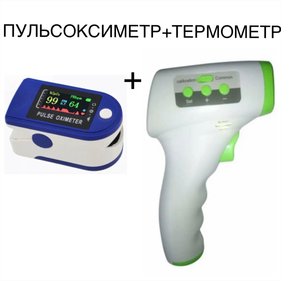 Купить Комплект: пульсоксиметр + термометр бесконтактный инфракрасный. Здоровье- 4.(в комплекте батарейки)