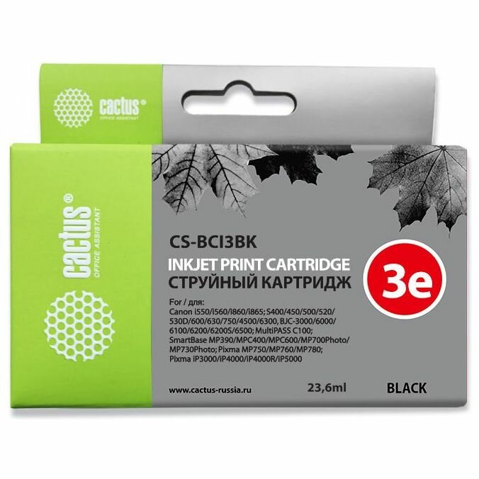 Картридж струйный Cactus CS-BCI3BK черный (23.6мл) для Canon BJC-3000/6000/6100/6200/6200S/S400/S450/i560/i560S/i860/i865/C100/MP390/MPC400/700/730/750/760/780/iP3000/i6500/iP4000/iP4000R/iP5000