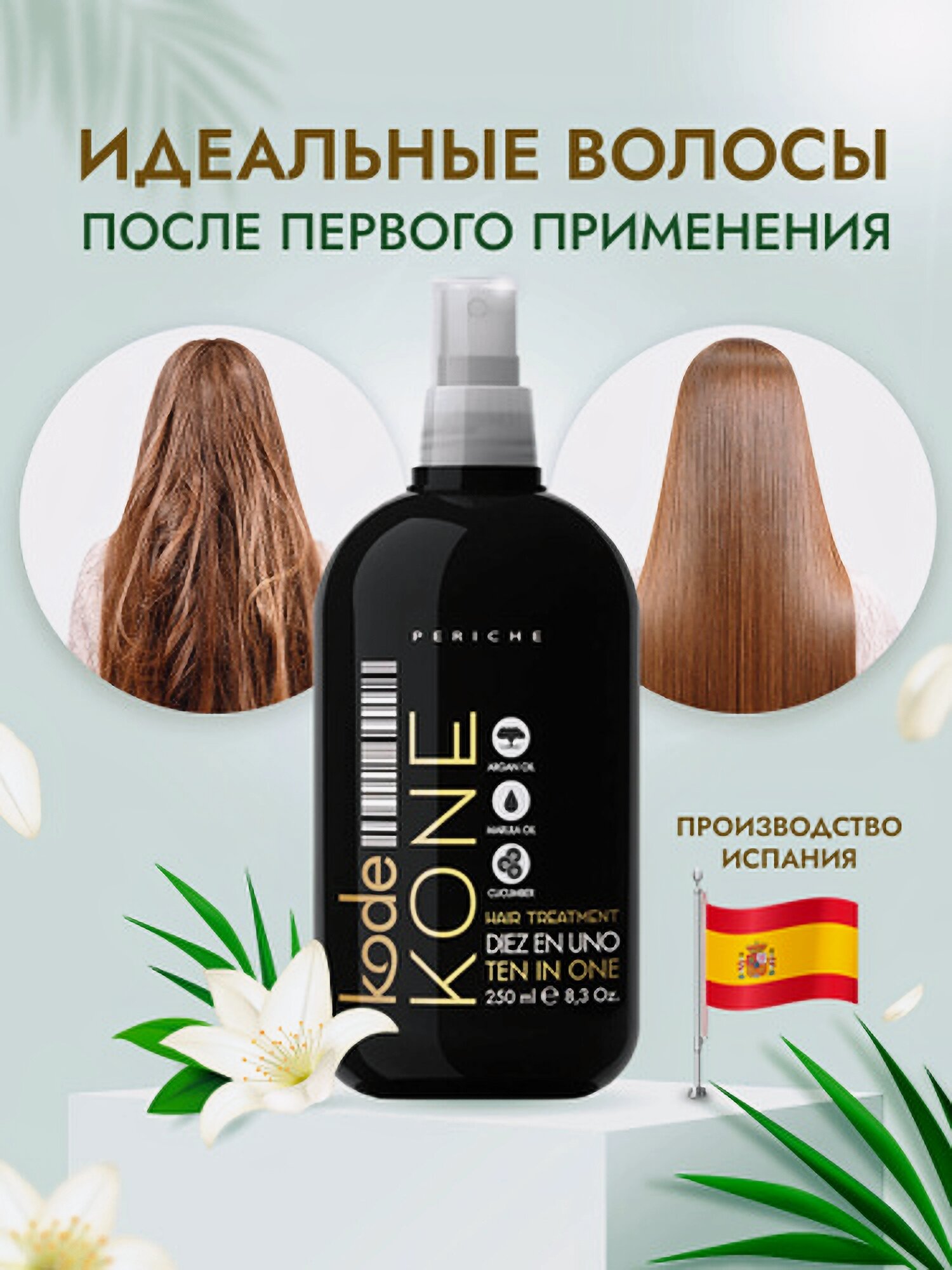 Periche Profesional Несмываемая маска-спрей 10 в 1 Kode "KONE Hair Treatment Ten In One", 250мл / спрей восстанавливающий / спрей термозащитный / Маска восстанавливающая несмываемая /маска разглаживающая /спрей облегчающий расчесывание
