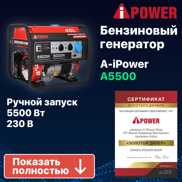СохранитьБензиновый генератор A-iPower A5500, 5,5кВт, с ручным запуском интересное: