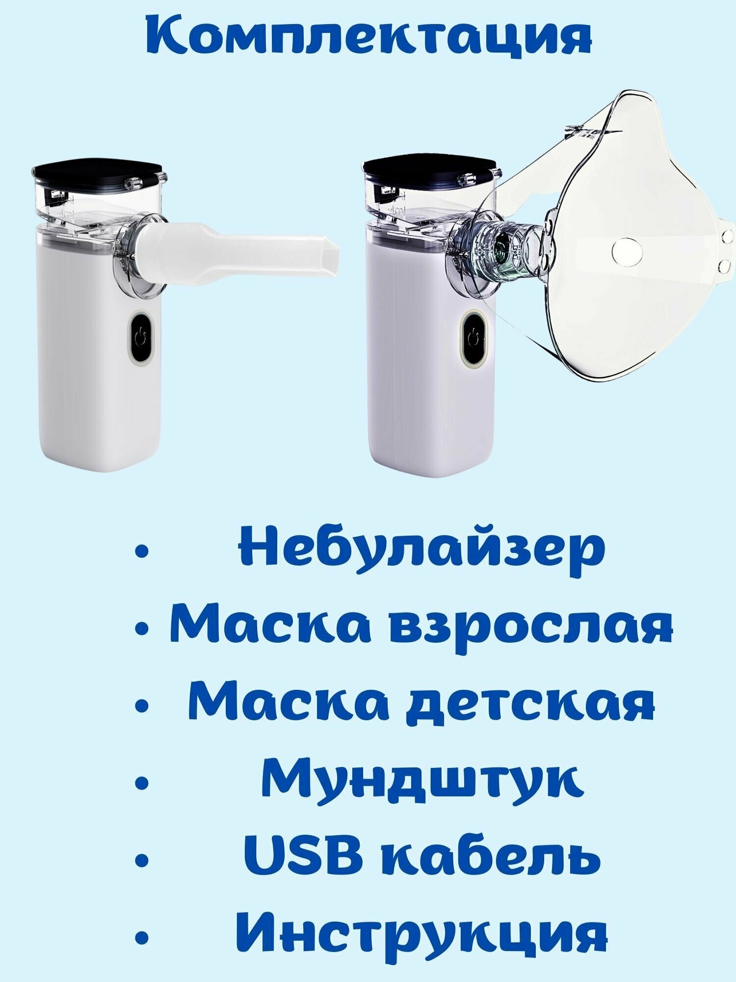 | Подробная комплектация | Коробка, ингалятор - 1 шт., насадки - (детская, взрослая, мундштук), usb-кабель. |