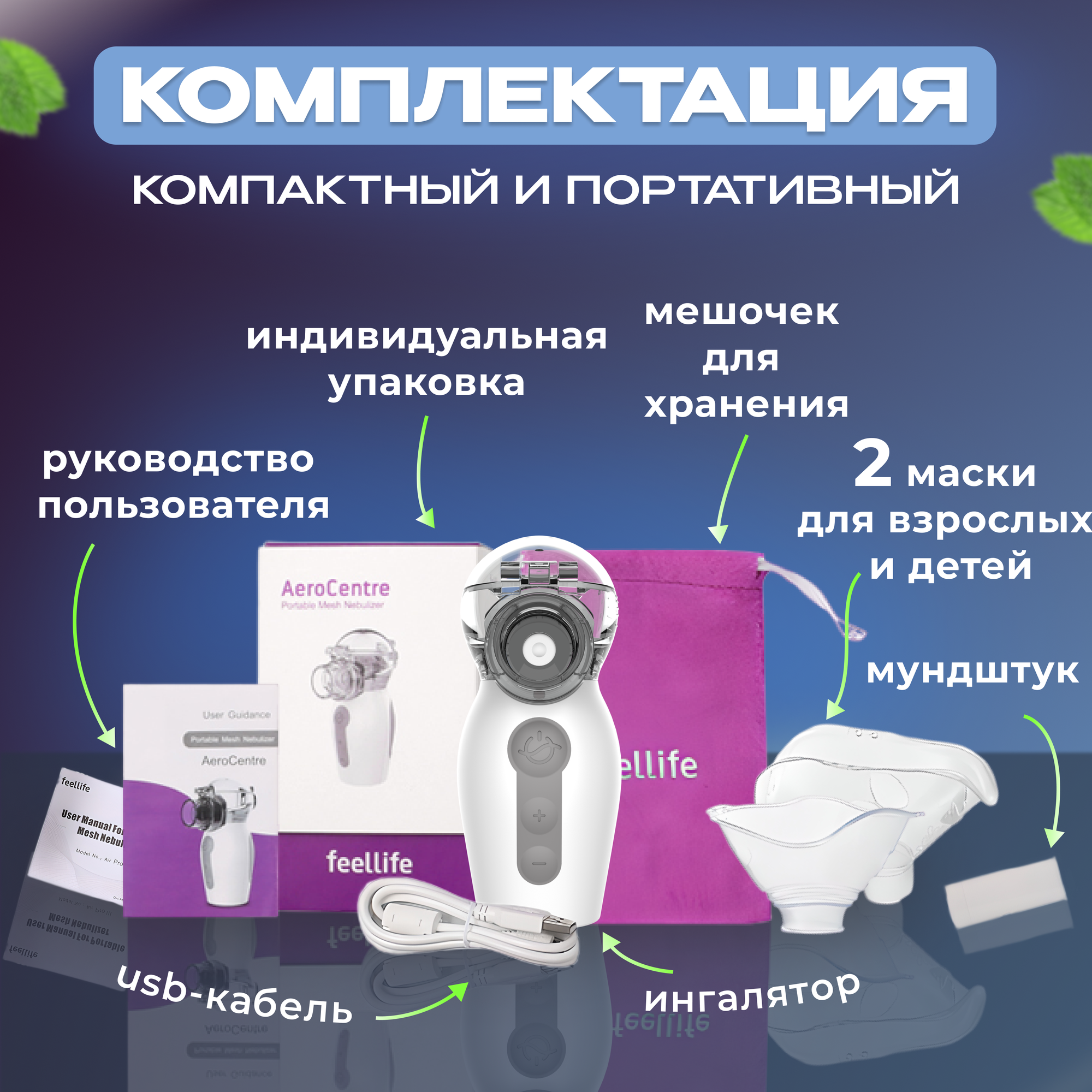 | Насадки в комплекте | маска взрослая / маска детская / мундштук |