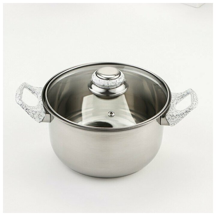 Набор посуды из нержавеющей стали Доляна «Мрамор», 8 предметов: ковш 1,5 л, 2 кастрюли 2/3 л, сковорода d=24 см, крышки, стенки 0,3 мм, дно 5 мм