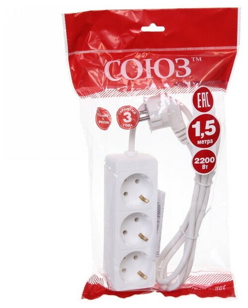 Удлинитель Союз 481S-9301, 3 розетки, 1.5 м, с/з, 10А / 2200 Вт