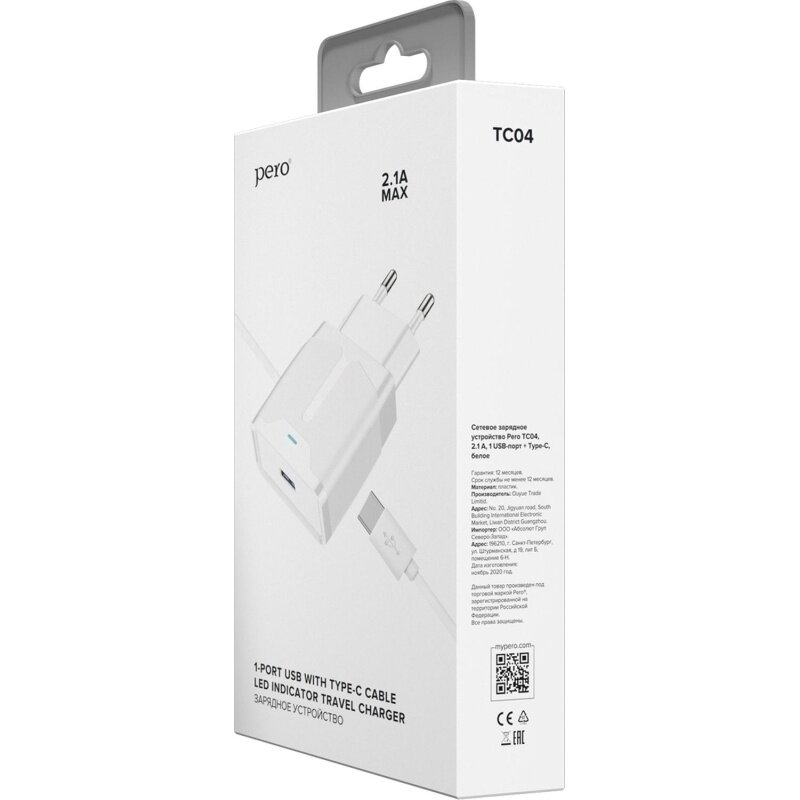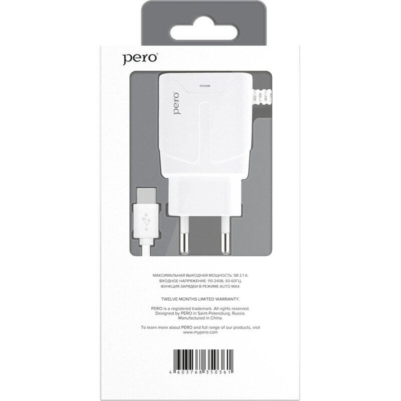 З/у сетевое PERO TC04 1USB 2.1A + TYPE-C CABLE белый Pero 1598908 4603768350361
