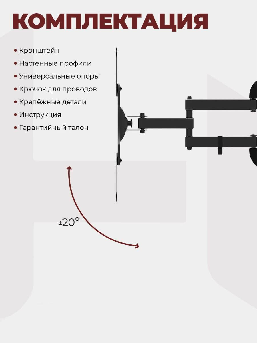 | Отзыв: | С первого взгляда кронштейн показался надежным и вызвал доверие, по факту так и есть - телевизор с 45 дюймами уже долго висит, все ок. Есть возможность поворота и наклона, работает легко и плавно. Отличный кронштейн, а в комплектации есть все что нужно для установки. |