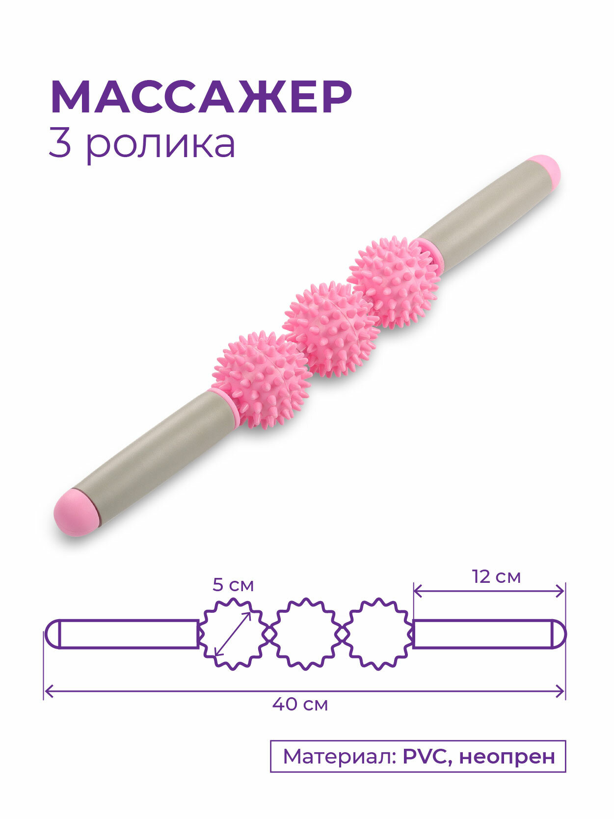 Роликовый ручной массажер для тела/Массажер для спины/Ролик антицеллюлитный/Скалка массажная INDIGO 3 ролика розовый 40x5,5x5,5см интересное:
