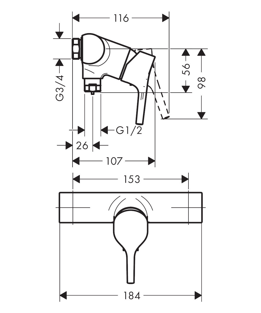 Смеситель для душа, однорычажный, межосевое подключение 153 мм, ВМ Hansgrohe 72601000