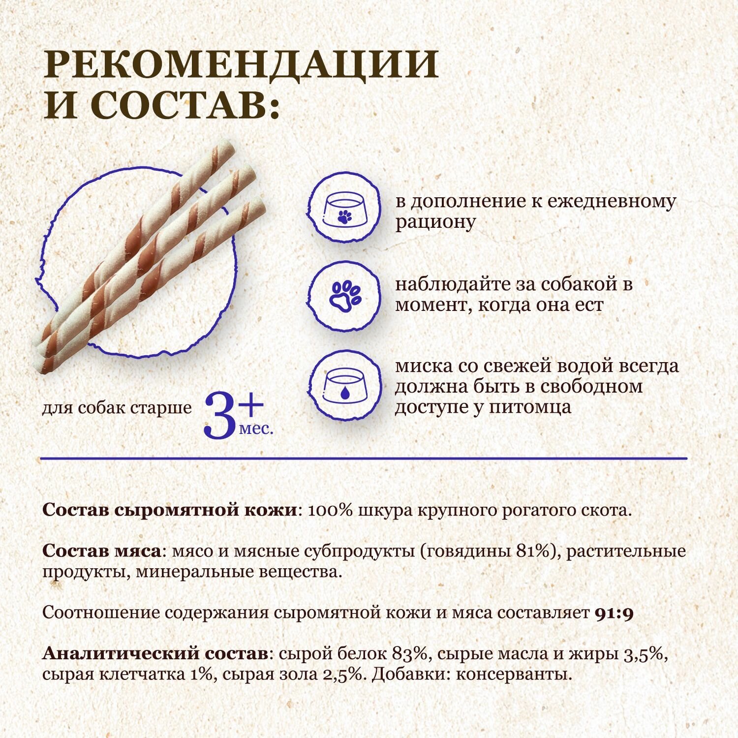 | Состав | состав сыромятной кожи: 100% шкура крупного рогатого скота; состав мяса: мясо и мясные субпродукты (говядины 81%), растительные продукты, минеральные вещества; соотношение содержания сыромятной кожи и мяса составляет 91:9; аналитический состав: сырой белок 83%, сырые масла и жиры 3.5%, сырая клетчатка 1%, сырая зола 2.5%; добавки: консерванты. |