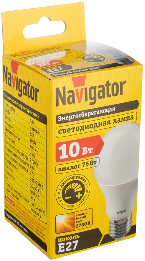 Светоиодная лампа Navigator 14 122 диммируемая, 10 Вт, Е27, теплого света 2700К, 1 шт.
