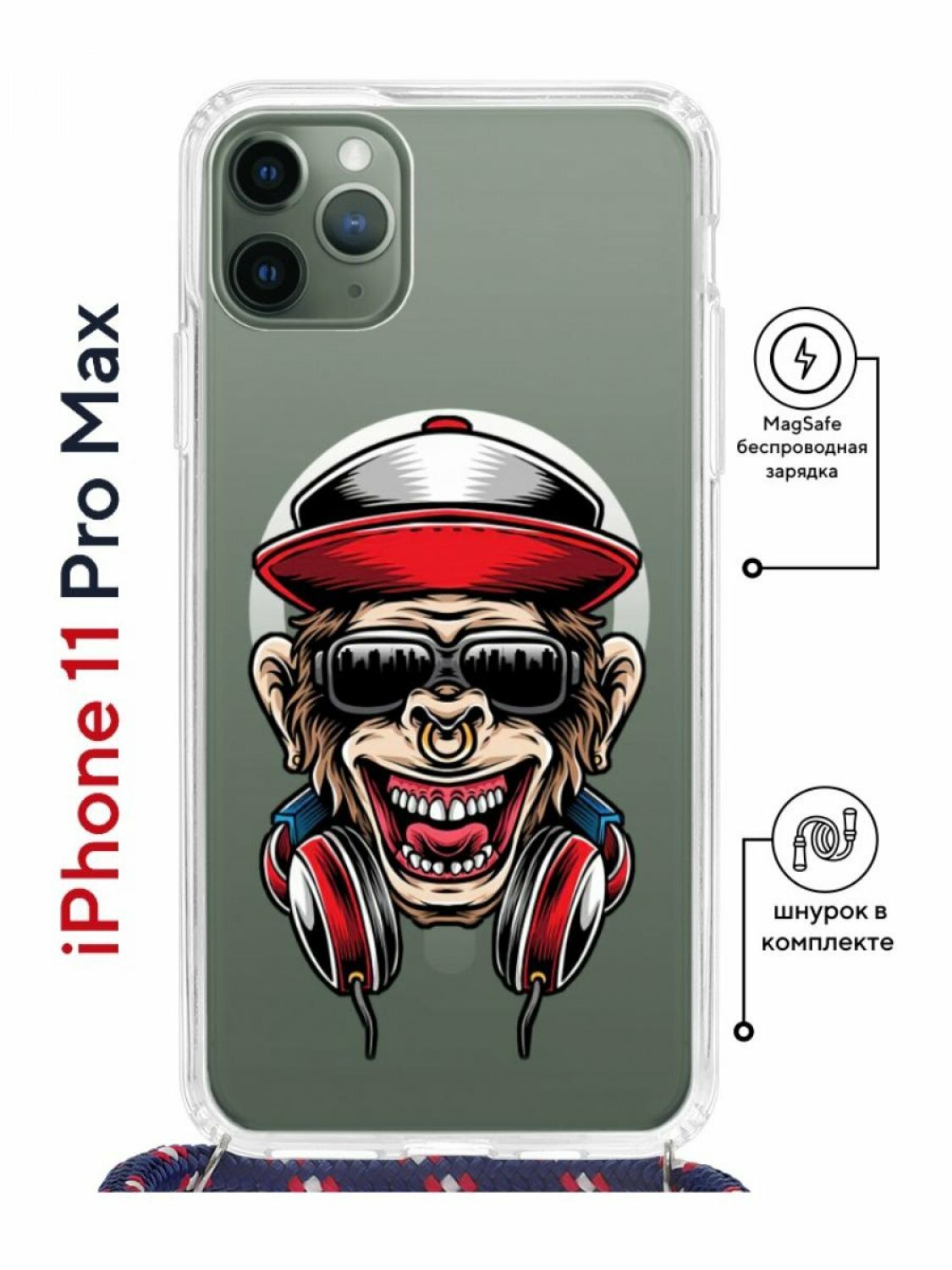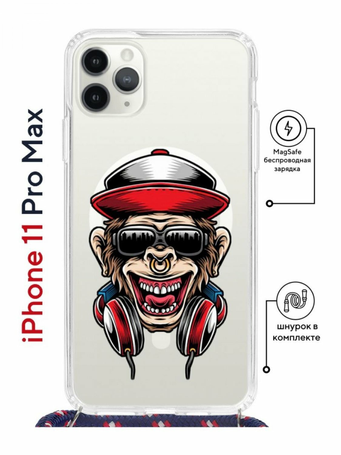 Купить Чехол для Apple iPhone 11 Pro Max Kruche Print MagSafe Magrope Обезьяна,пластиковая накладка со шнурком и рисунком,противоударный силиконовый бампер
