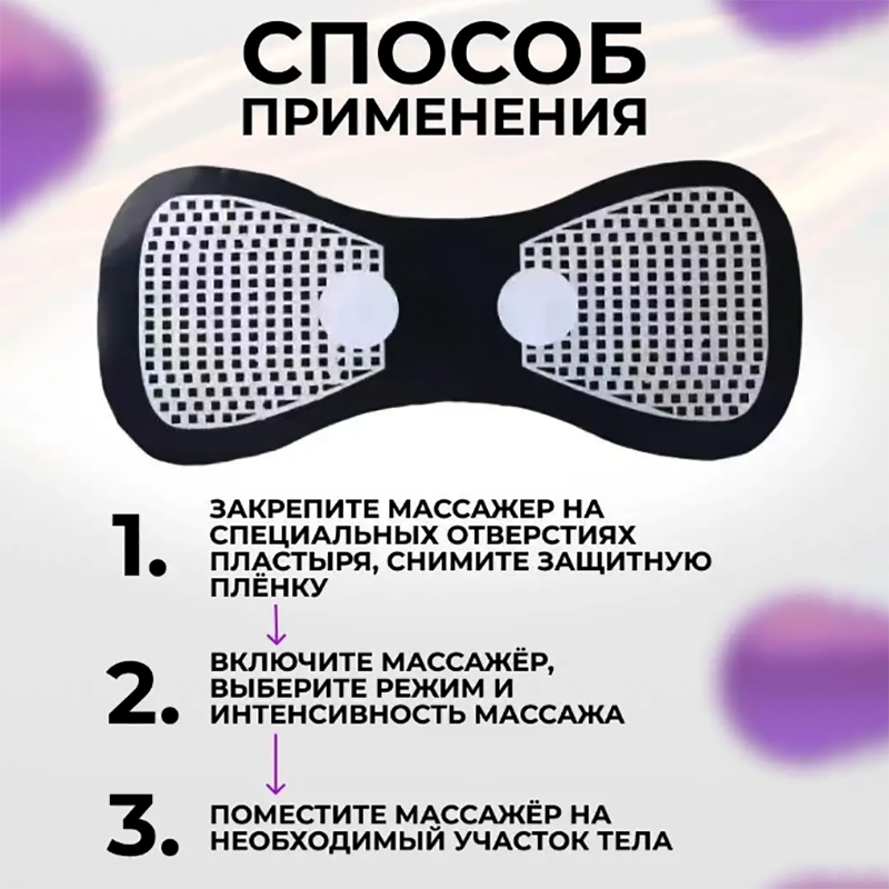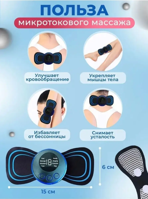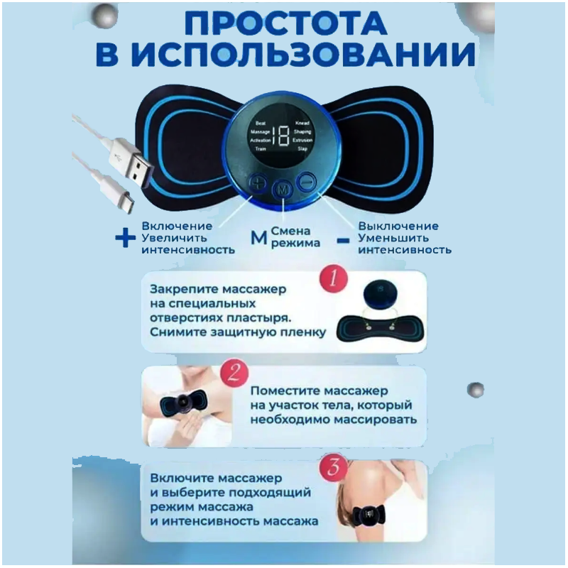 | Комплектация | Пульт управления, накладной миостимулятор, кабель USB. |