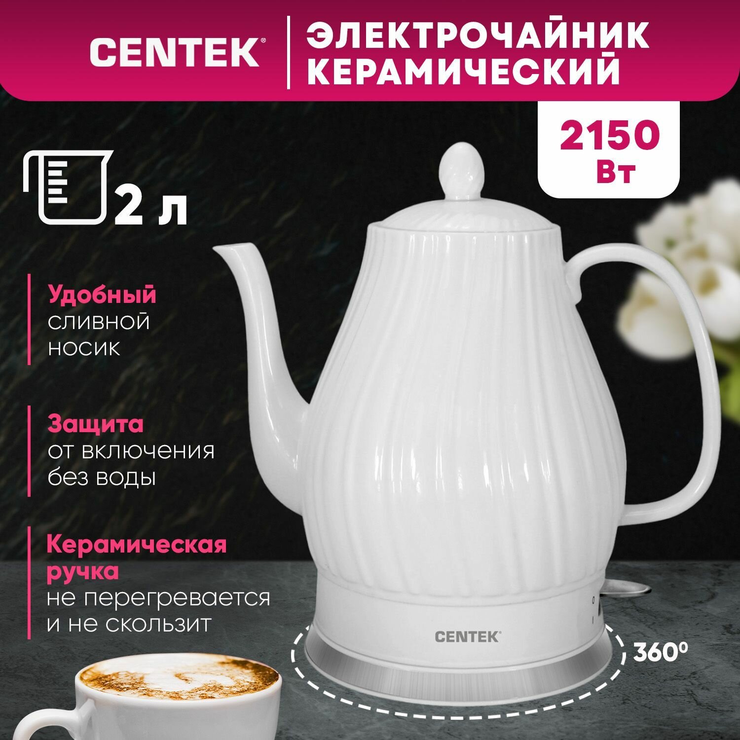 Чайник Centek CT-0064 супербелая керамика, 2л, 2150Вт, рельефный корпус