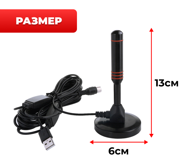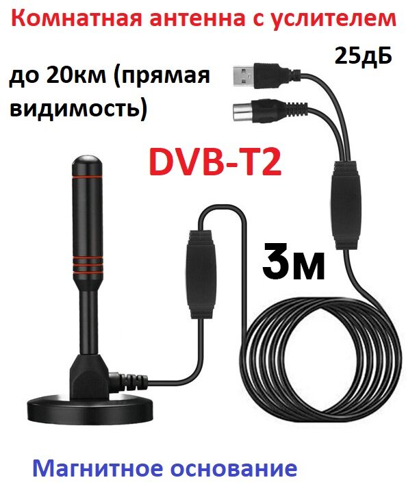 ТВ антенна комнатная с усилителем сигнала на магните (USB,25дБ) черная