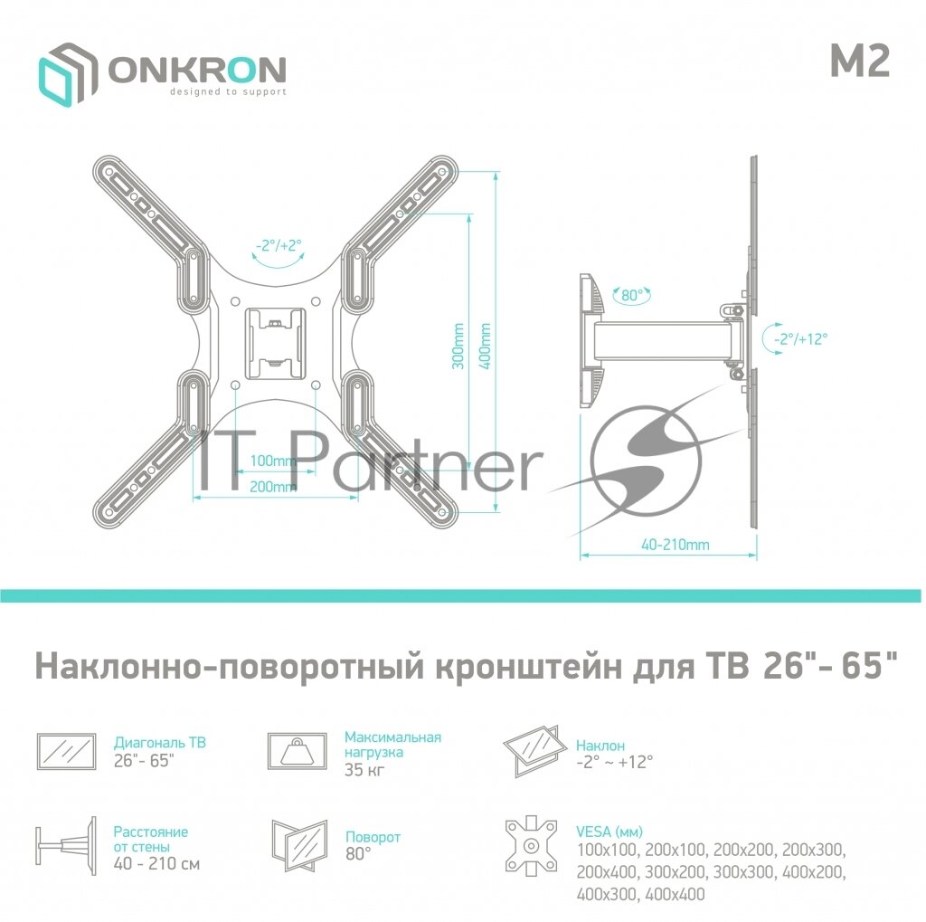 Кронштейн ONKRON M2, для ТВ, наклонно-поворотный, 26"-65", 40-210 мм от стены