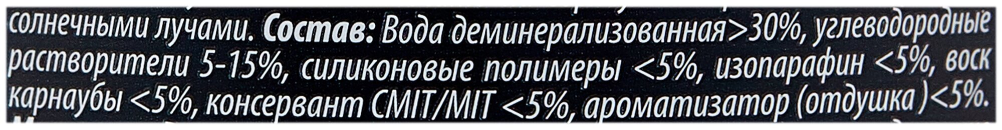 | Состав | вода, углеводородные растворители, силиконовые полимеры, изопарафин, воск карнаубы, консервант, отдушка |