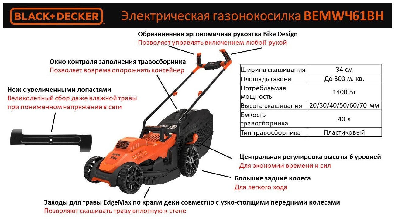 Газонокосилка колесная электрическая (Bike Design, 34 см, 40л, 1400 Вт, E-Drive, Edge Max, 20-70мм мм) BLACK+DECKER BEMW461BH-QS интересное: