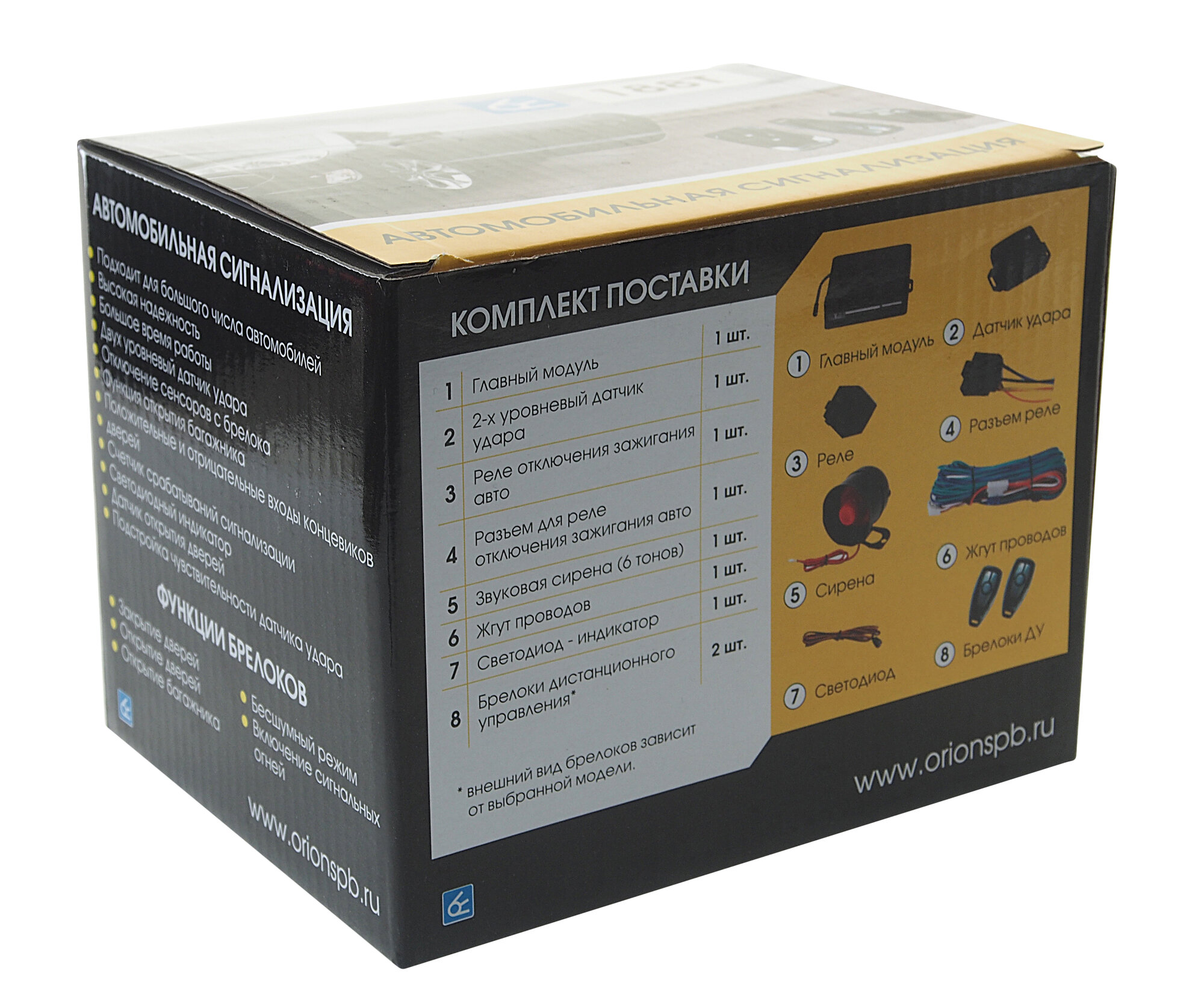 | Подробная комплектация | коробка упаковочная, инструкция по эксплуатации, блок управления 2 шт, жгут проводов, датчик удара, жгут реле, реле, сирена, провод индикации со светодиодом, скотч двусторонний большой, скотч двусторонний маленький |