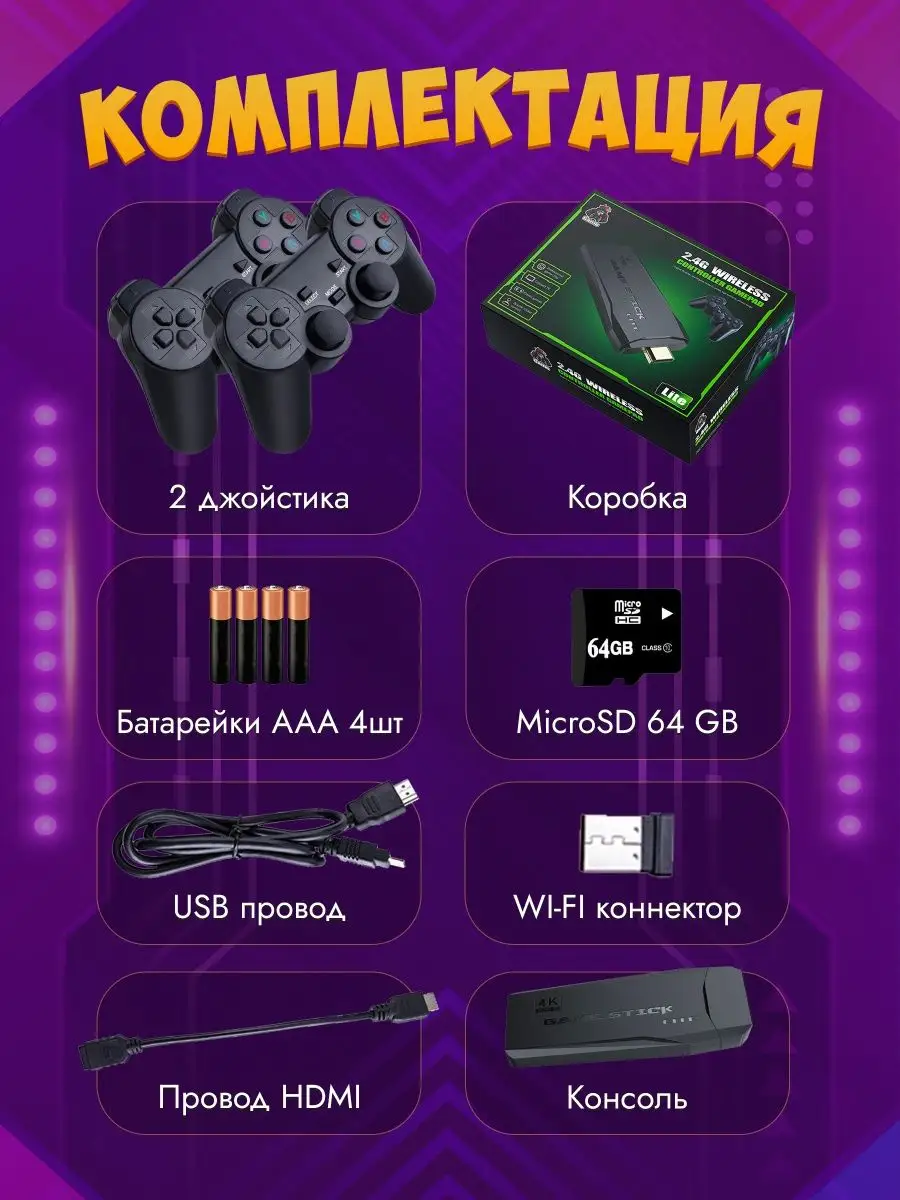 | Подробная комплектация | Игровая консоль - 1 шт; Джойстики-2 шт; hdmi-переходник-1шт; Кабель питания-1шт; microSD 64GB-1шт |